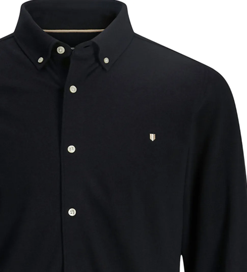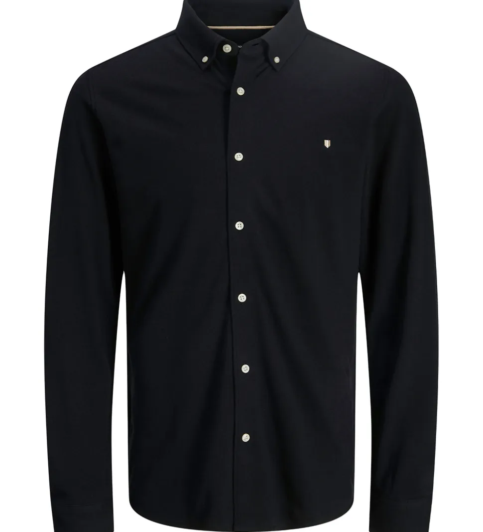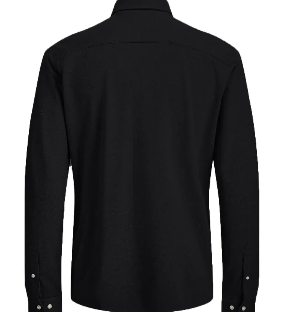 Stilfuld Jack & Jones skjorte i sort piqué med hvide knapper. Skjorten har en klassisk skjortekrave og gennemgående knapper fortil. Den har lange ærmer med manchetknapper.