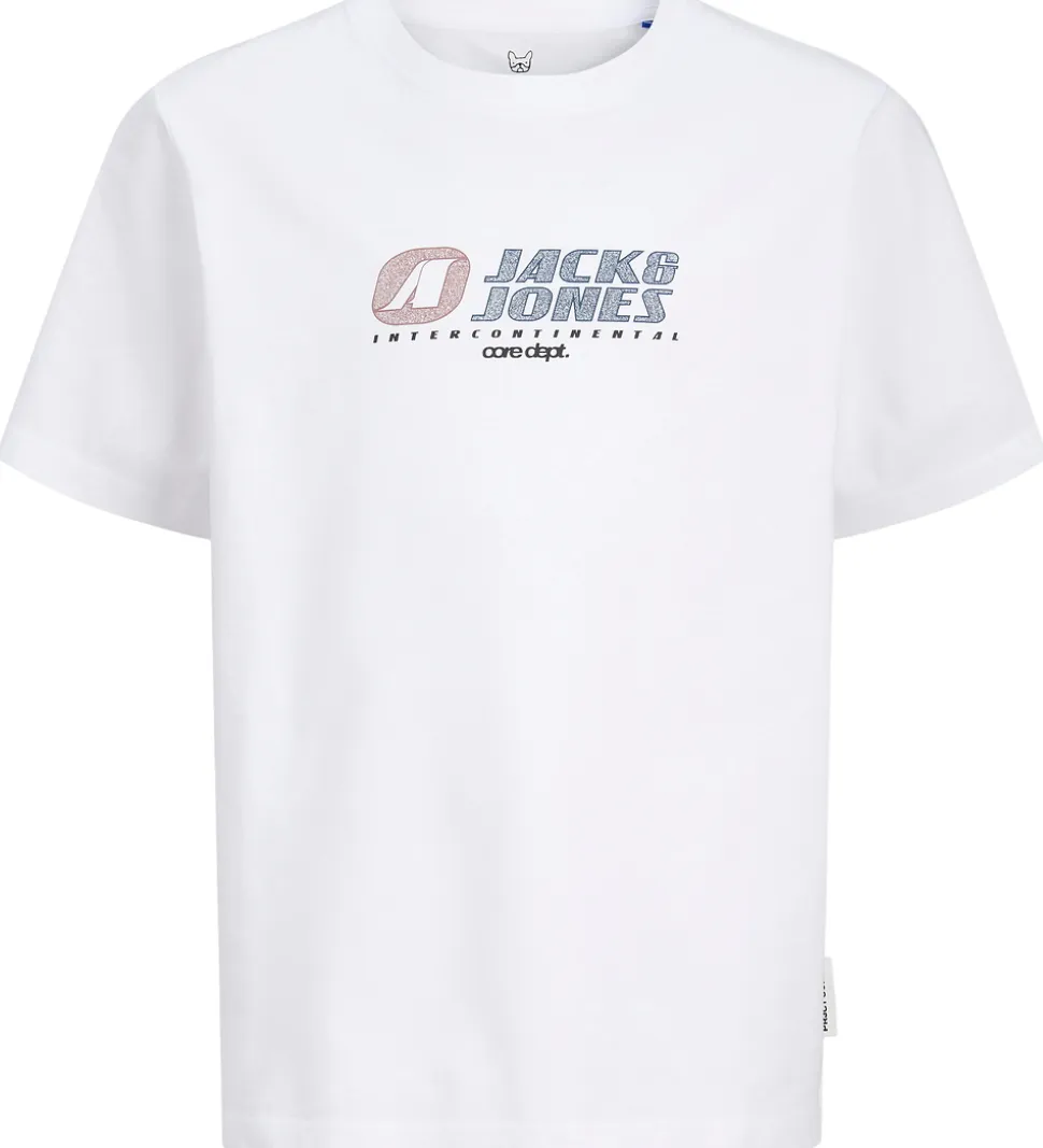 Skøn Jack & Jones t-shirt i hvid farve med et sporty logprint på fronten i rød, blå og sort. T-shirten har en rund halsudskæring med en smal ribkant og korte ærmer.