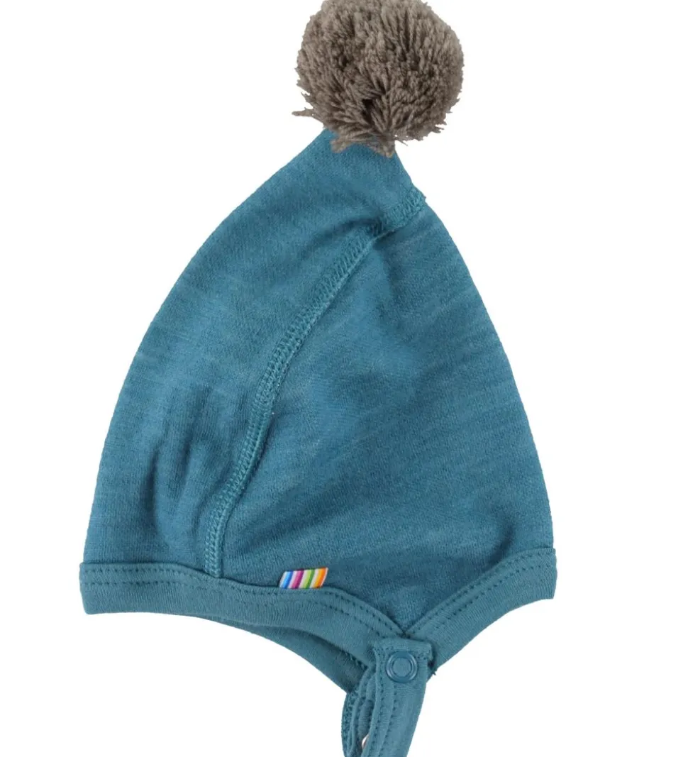 Fed Joha babyhjelm i blå, med en brun pompon i toppen.