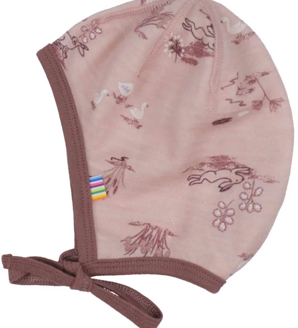 Charmerende Joha babyhjelm i en blød, rosa nuance med et fint mønster af dyr og blomster. Babyhjelmen er lavet af let stof, der sikrer en god pasform.