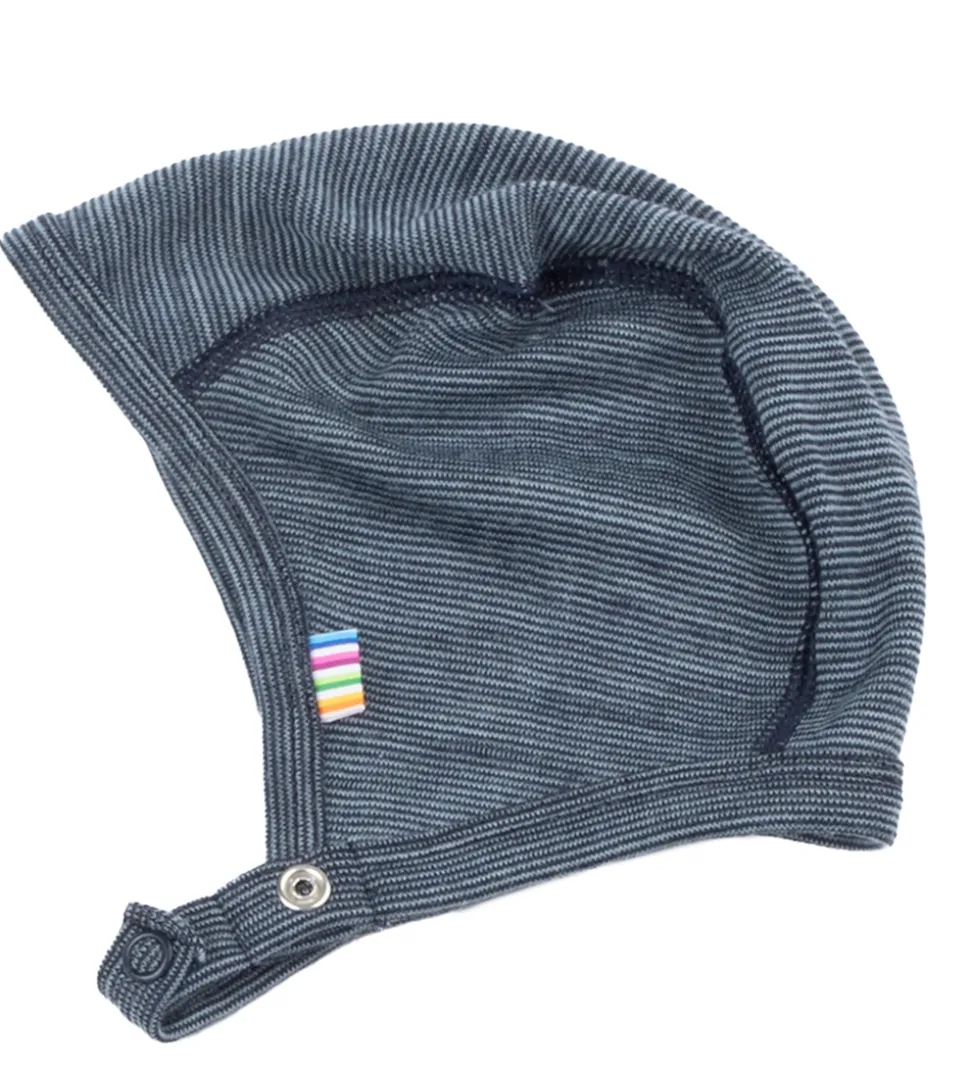 Hjelmen har en enkel, rund form og lukkes nemt med en trykknap under hagen, som har to indstillinger. Joha babyhjelmen er fremstillet i en blød og behagelig uldkvalitet.