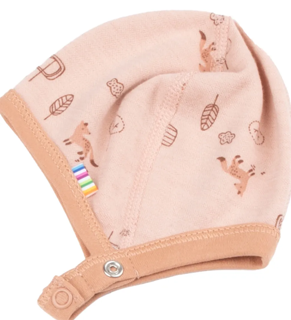 Charmerende Joha babyhjelm i en lys rosa nuance med et sødt print af små ræve, blade og træer i brune og fersken nuancer.