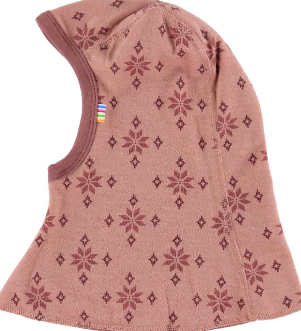 Flot Joha elefanthue i rosa med snefnugmønster. Joha elefanthuen består af to lag og har en spids hovedform med lysebrun kant.