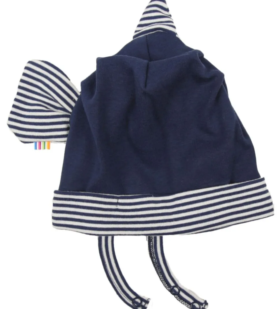 Hatten er marineblå med stribede detaljer.