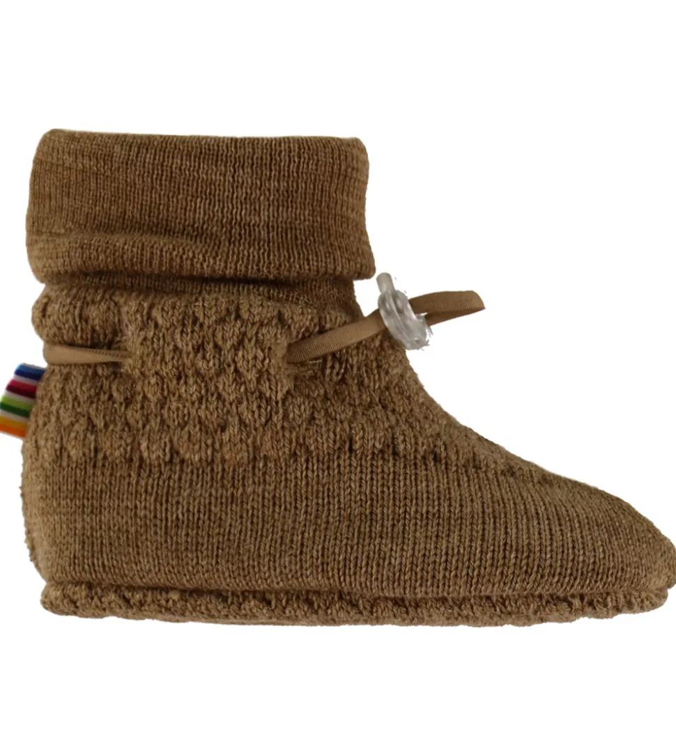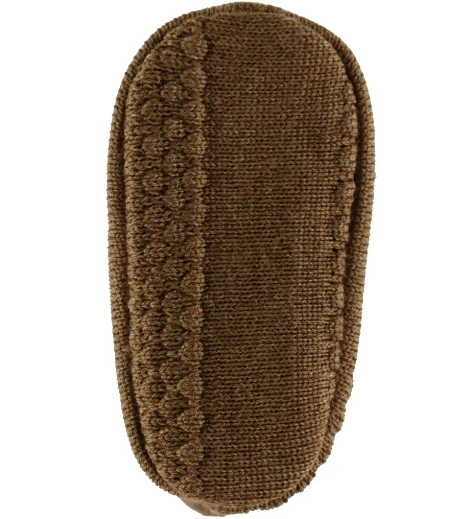 Behagelige Joha futter i brun strik med stribet struktur. Joha futterne har ribkant øverst og en elastik omkring anklerne, som kan strammes med et spænde. De er fremstillet af merinould.