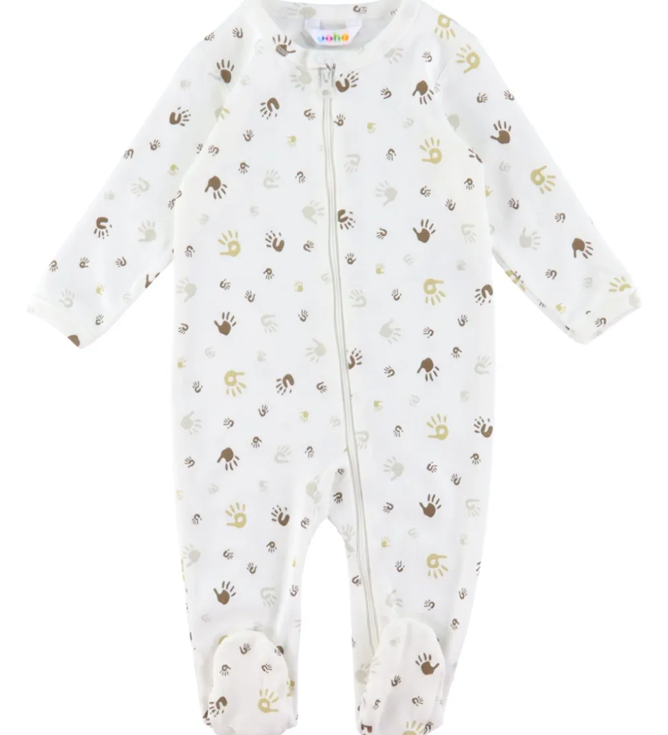 Praktisk Joha heldragt i off white med alloverprint af søde håndaftryk i brune og beige farver.
