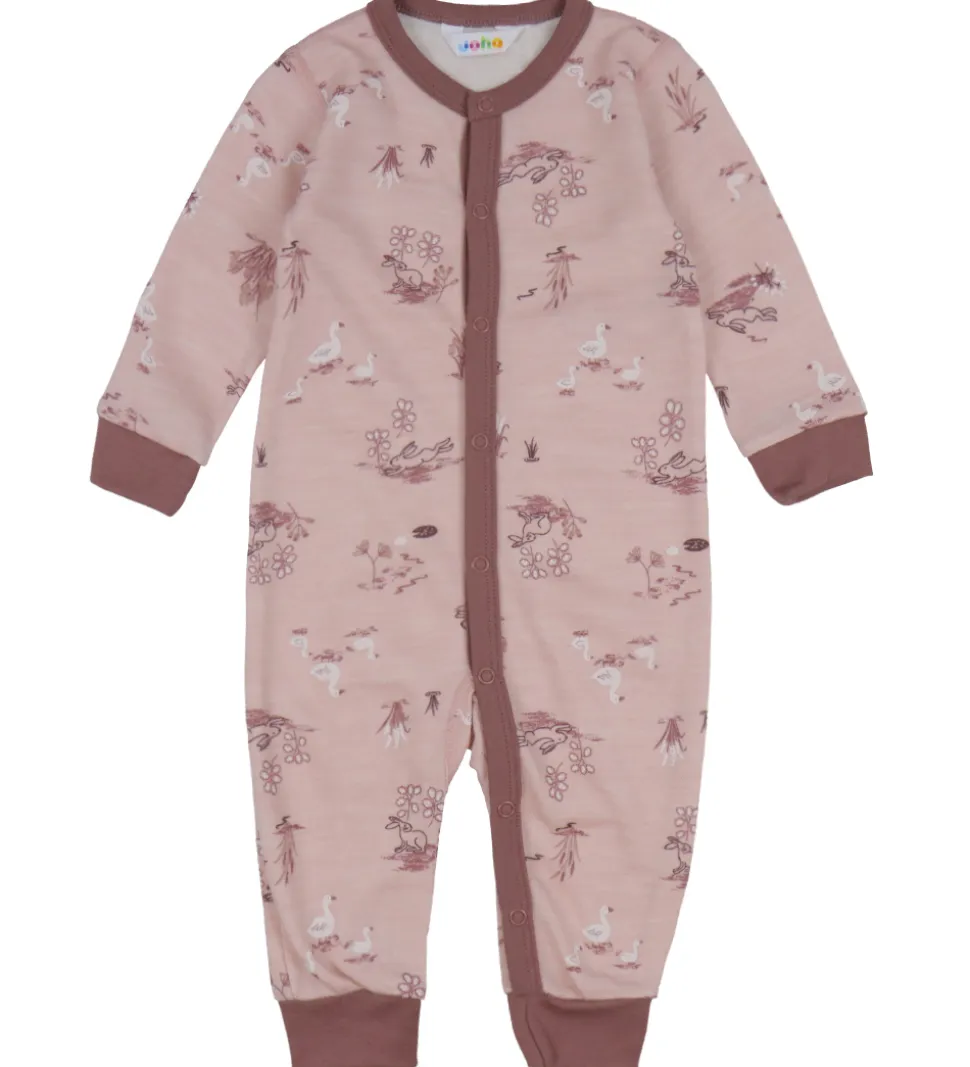 Charmerende Joha heldragt i en støvet rosa farve med et naturinspireret print af blomster og fugle. Det subtile mønster gør heldragten både sød og enkel.