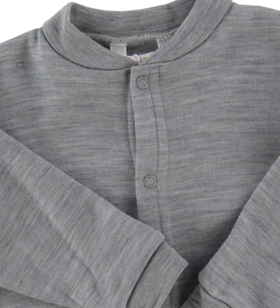 Den har lange ærmer og ben, lukkes med trykknapper fortil og har ombuk ved fødderne.