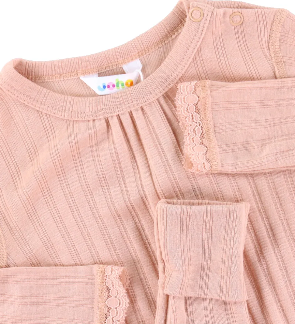Joha heldragten lukkes med praktiske trykknapper mellem benene og ved den venstre skulder, så den er nem at få af og på. Heldragten har lange ærmer og fine blondekanter ved håndleddene, som giver et sødt udtryk. Der er ombuk ved anklerne som kan foldes om til fødder, for ekstra varme og komfort.