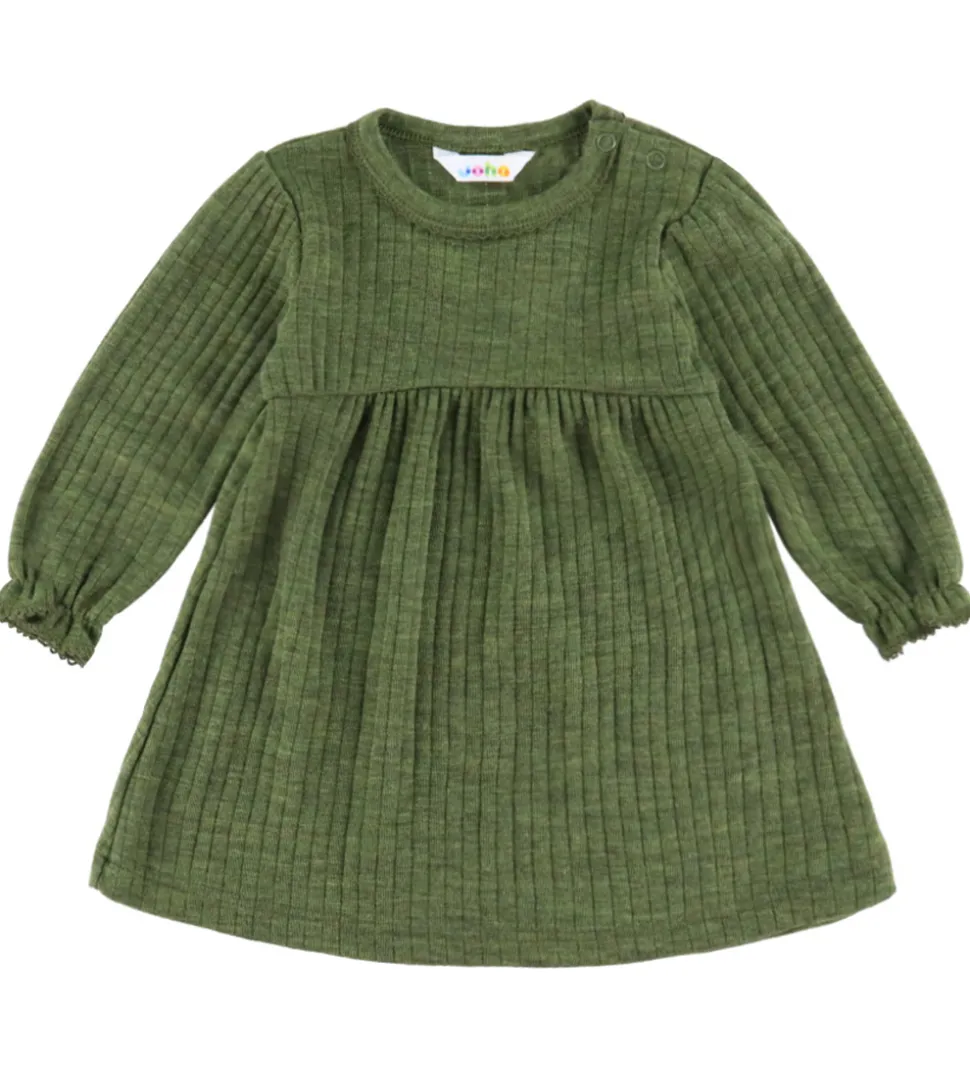 Stilfuld Joha kjole i en dyb, olivengrøn farve. Joha kjolen har lange ærmer og en flot struktur med fine ribdetaljer. Den runde hals og knaplukningen på skulderen skaber en enkel, men elegant silhuet.