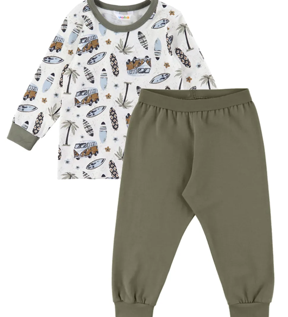 Attraktiv Joha nattøj bestående af en nattrøje og et par natbukser. Nattrøjen er i off white med surf-, folkevognsrugbrød og palmeprint. Natbukserne er i en matchende olivengrøn nuance, hvilket giver et stilfuldt og komfortabelt look til nattens hvile.