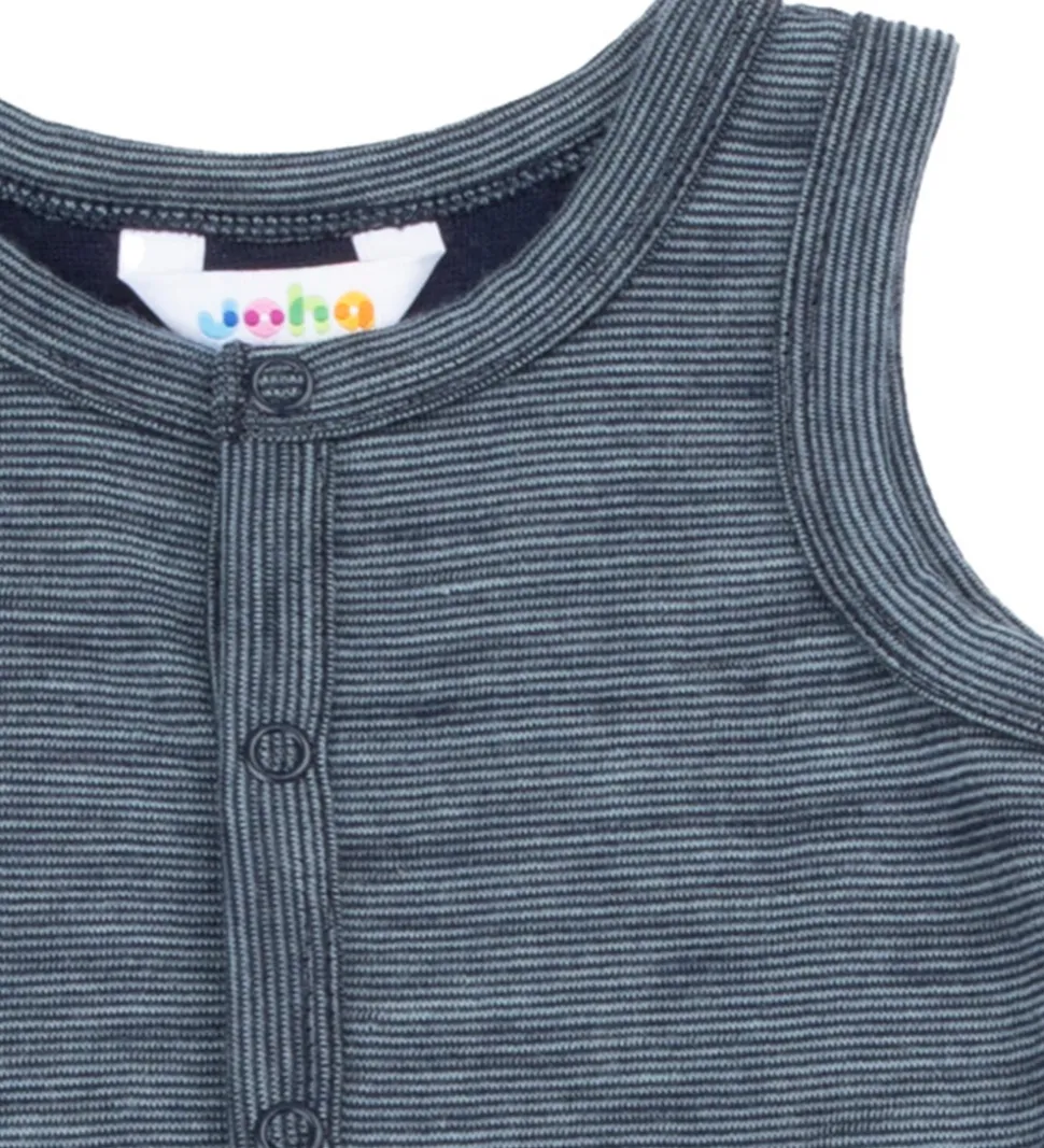 Joha sparkedragten er uden ærmer og har en praktisk knaplukning foran, der går hele vejen ned langs benene, hvilket gør det nemt at tage sparkedragten af og på. Der er en smal ribkant ved ærme- og halsåbningen for ekstra komfort og de integrerede fødder, sørger for at små fødder holdes varme.
