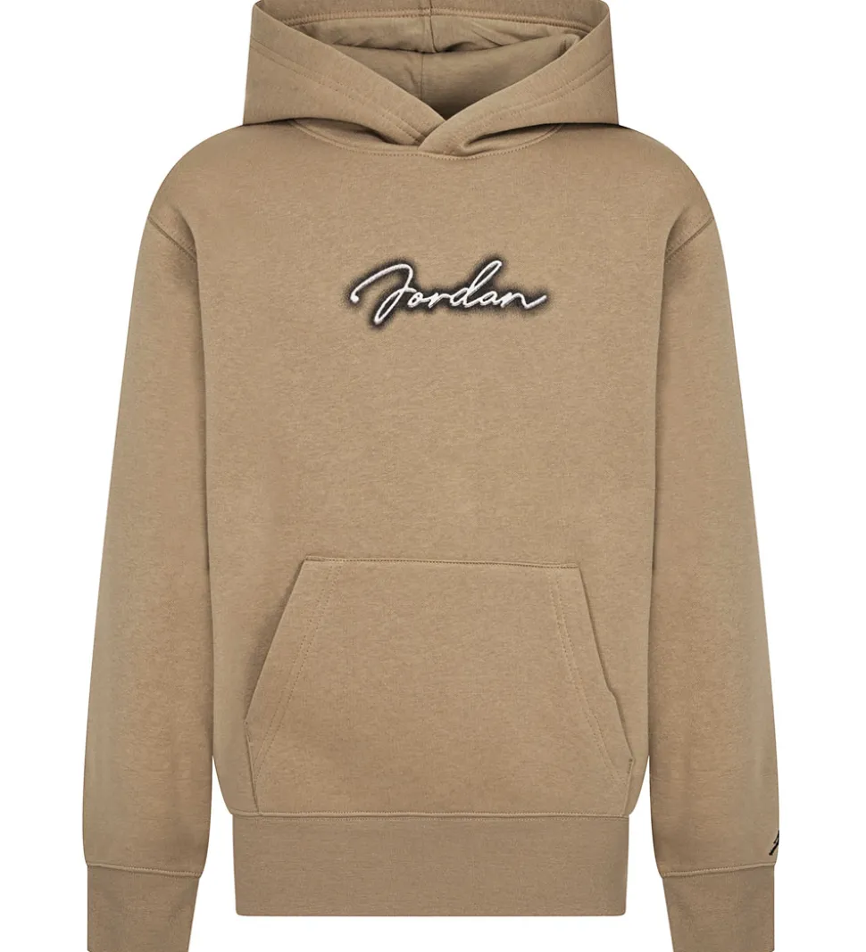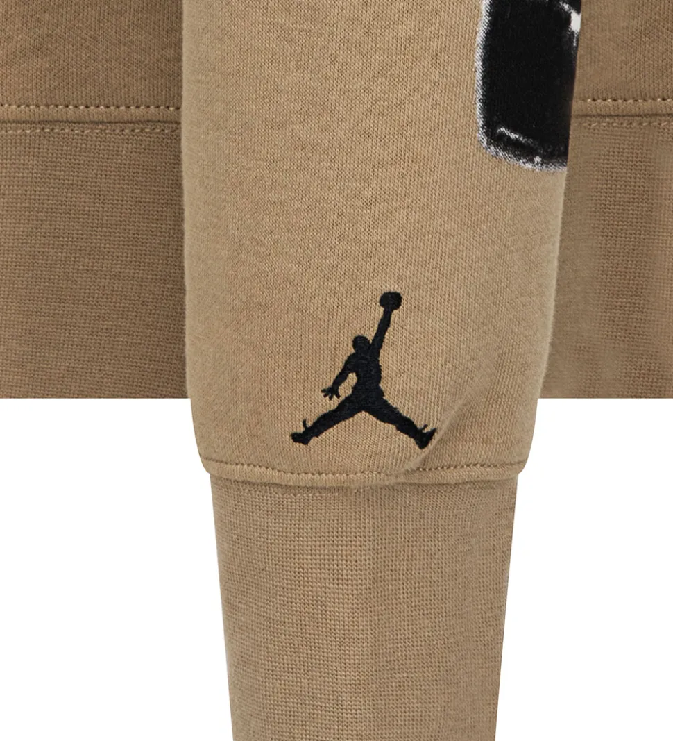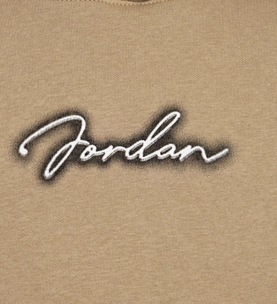 Lækker Jordan hættetrøje i en flot sandfarve med et logoprint på fronten, samt et stort print på bagsiden af hvert ærme. Denne hættetrøje har en praktisk kængurulomme og en behagelig hætte, perfekt til både afslapning og leg. På indersiden er der blødt, børstet bomuld.