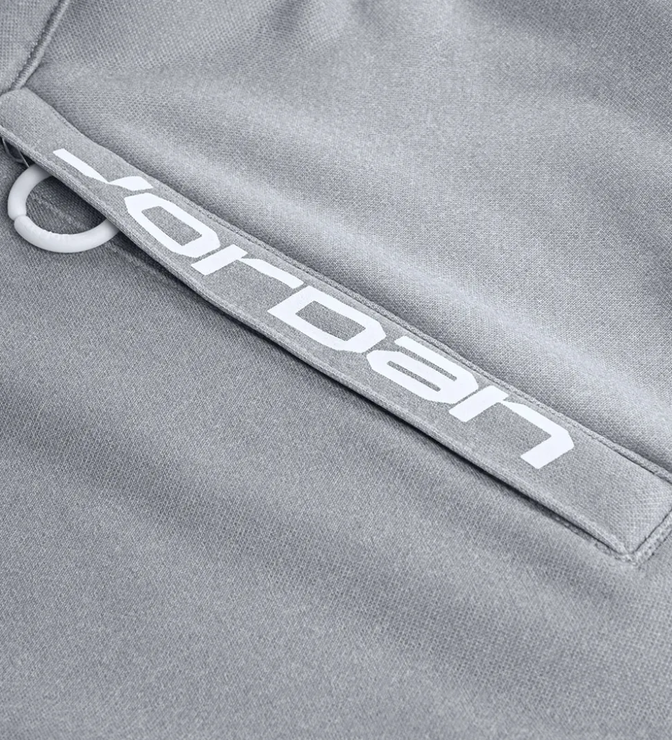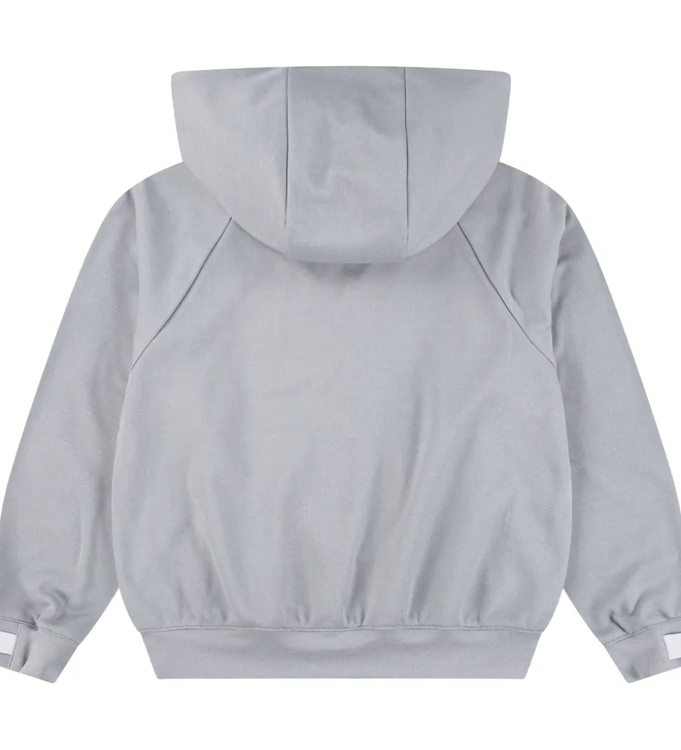 Smart Jordan hættetrøje i grå med et lille, hvidt logo på brystet. Hættetrøjen har en blød hætte, som lukkes sammen med en velcrolukning. Hættetrøjen har en kort lynlås ved venstre skulder med “Jordan” printet i hvid. Fortil er der en rummelig kængurulomme. I ærme- og taljeåbning er der brede ribkanter, og indvendigt er der en blødt, børstet polyester.