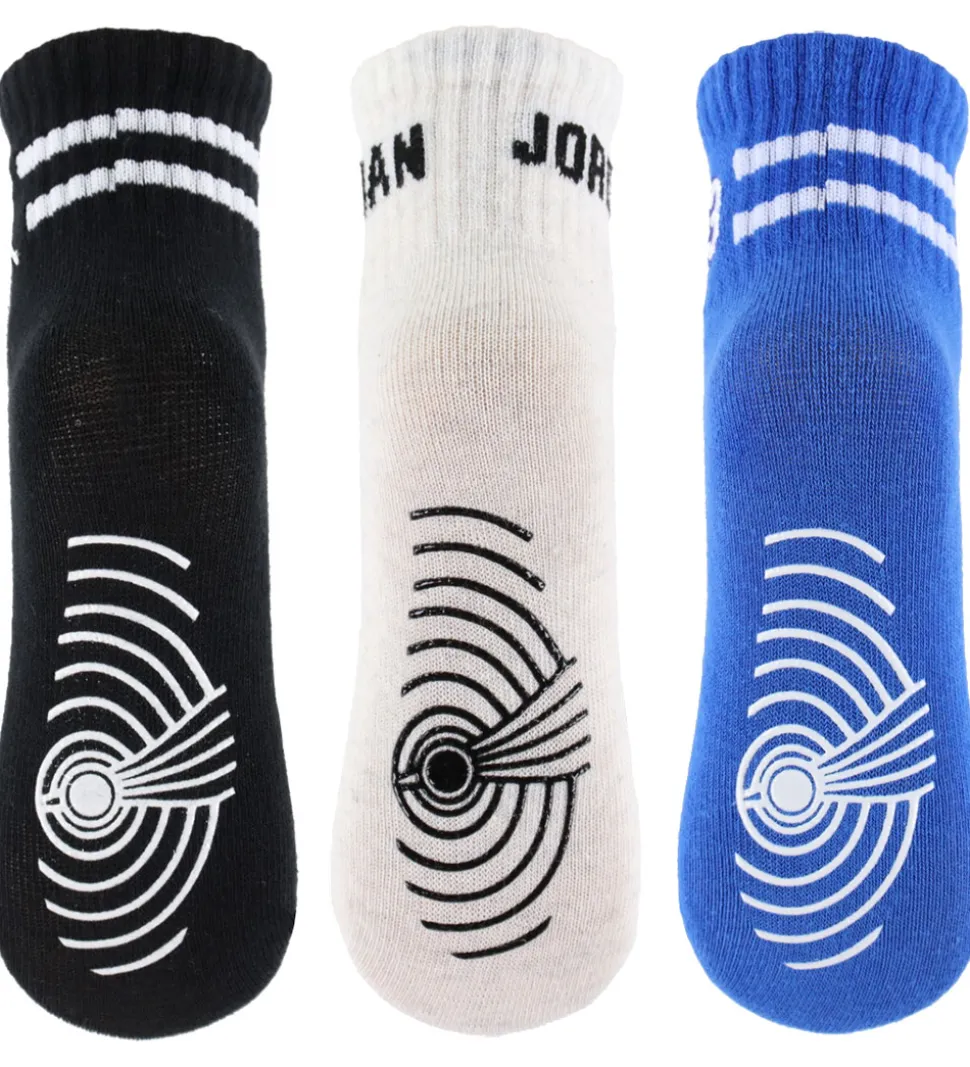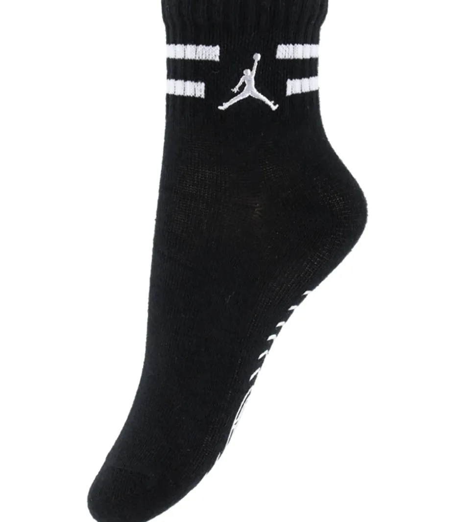 Funktionelle Jordan strømper solgt i en 3-pak med farverne sort, hvid og blå med forskellige hvide detaljer. Strømperne har et almindeligt længde skaft med ribstruktur som tennisstrømper, og på undersiden er der mænster af gummi, som giver et bedre fodfæste.