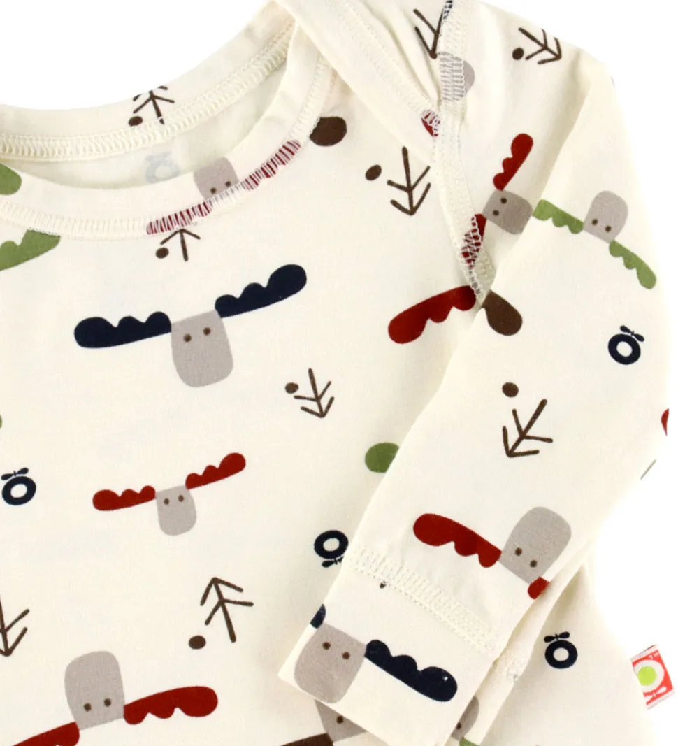 Charmerende Katvig body i råhvid med et alloverprint af elgehoveder og logoer i forskellige farver. Bodyen har en rund halsudskæring med en foldeskulder i den ene side og lange ærmer. Den lukkes mellem benene med trykknapper. Den er fremstillet af bambus viskose.