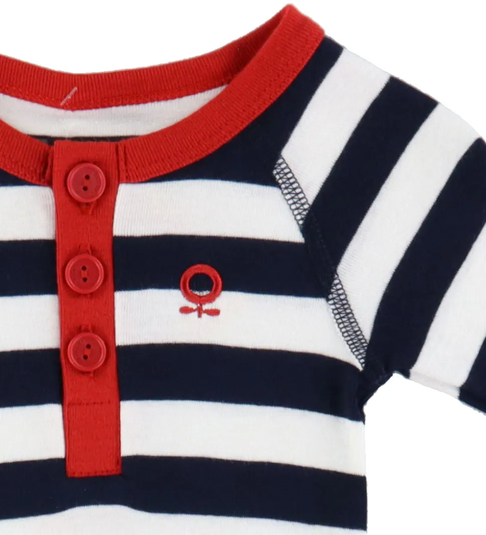 Heldragten har knaplukning øverst og et lille logo på brystet, hvilket tilføjer et charmerende touch til designet. Mellem benene kan heldragten åbnes helt op ved hjælp af trykknapper.
