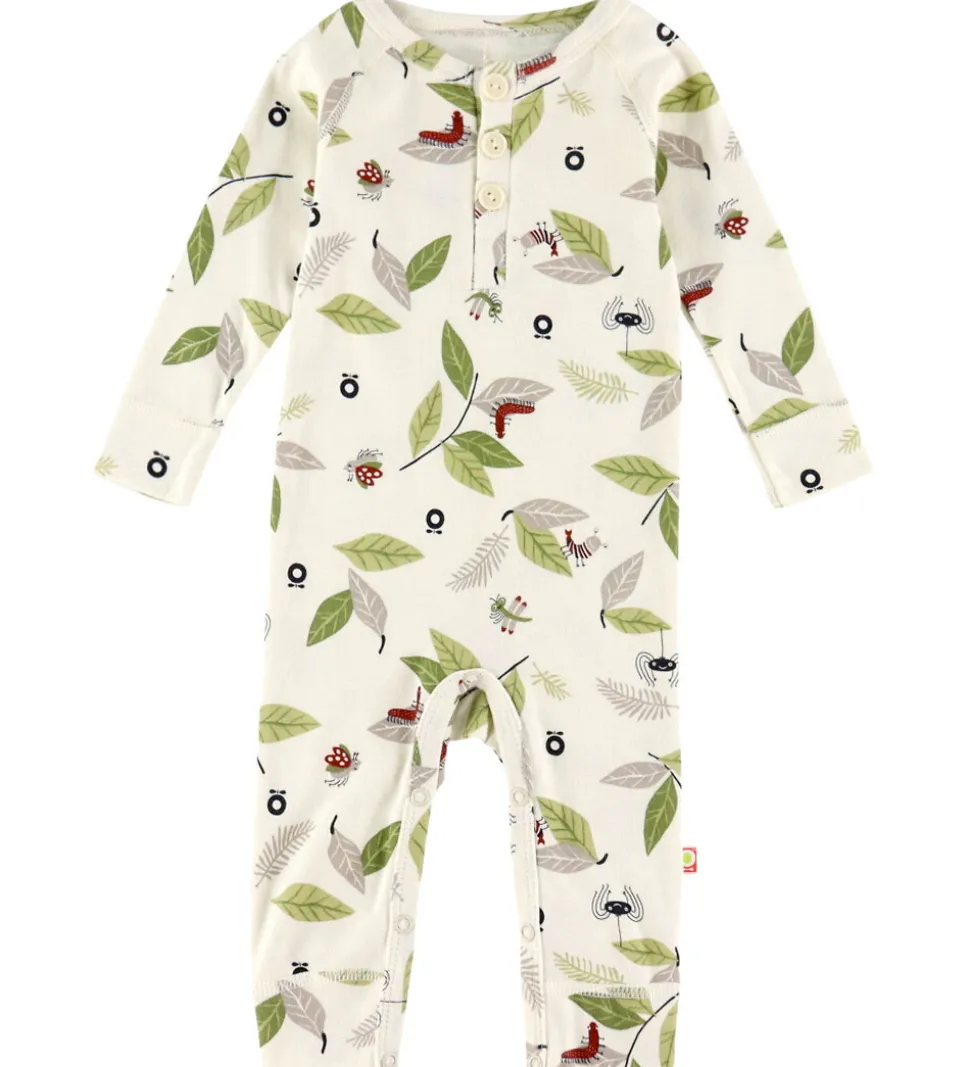 Charmerende Katvig heldragt i hvid med print af grønne blade og forskellige insekter. Heldragten har en rund halsudskæring med knapper foran. Den har lange ærmer og lange ben med trykknapper mellem benene.