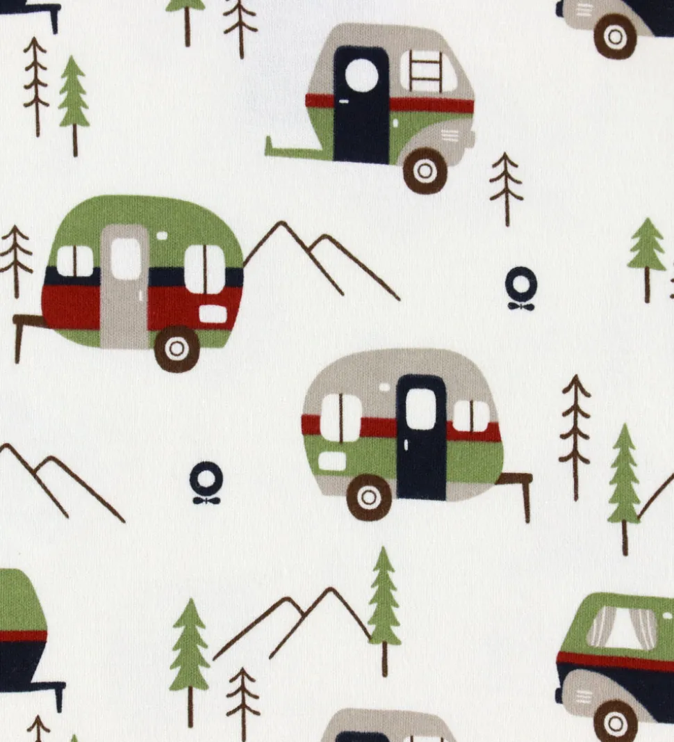 Charmerende Katvig leggings i hvid med campingprint. Katvig leggingsene har en elastisk talje og navyblå ribkanter ved anklerne.
