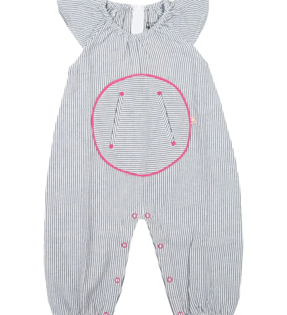 Heldragten er hvid og blåmeleret stribet med en stor pink cirkel på maven.