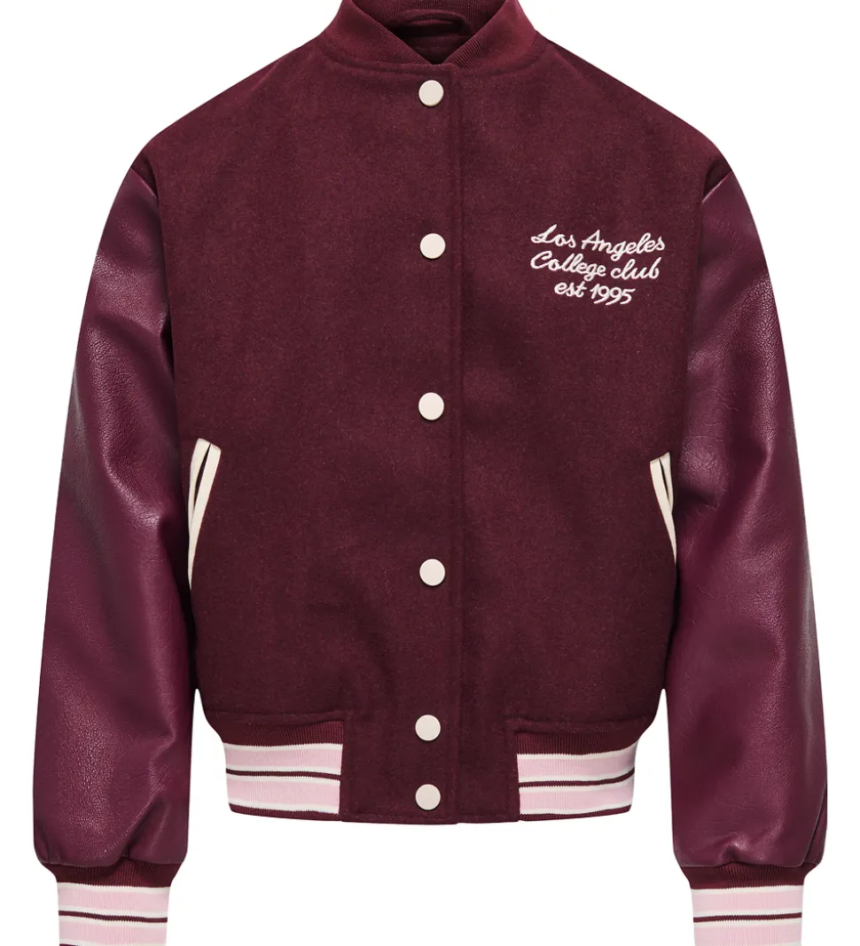 Stilfuld Kids Only bomberjakke i en dyb bordeaux nuance. Bomberjakken har flotte ærmer i læderlook og et broderet “Los Angeles College Club est. 1995” broderi på brystet, som tilføjer et sporty look. Kids Only leverer kvalitet og komfort i hver detalje.