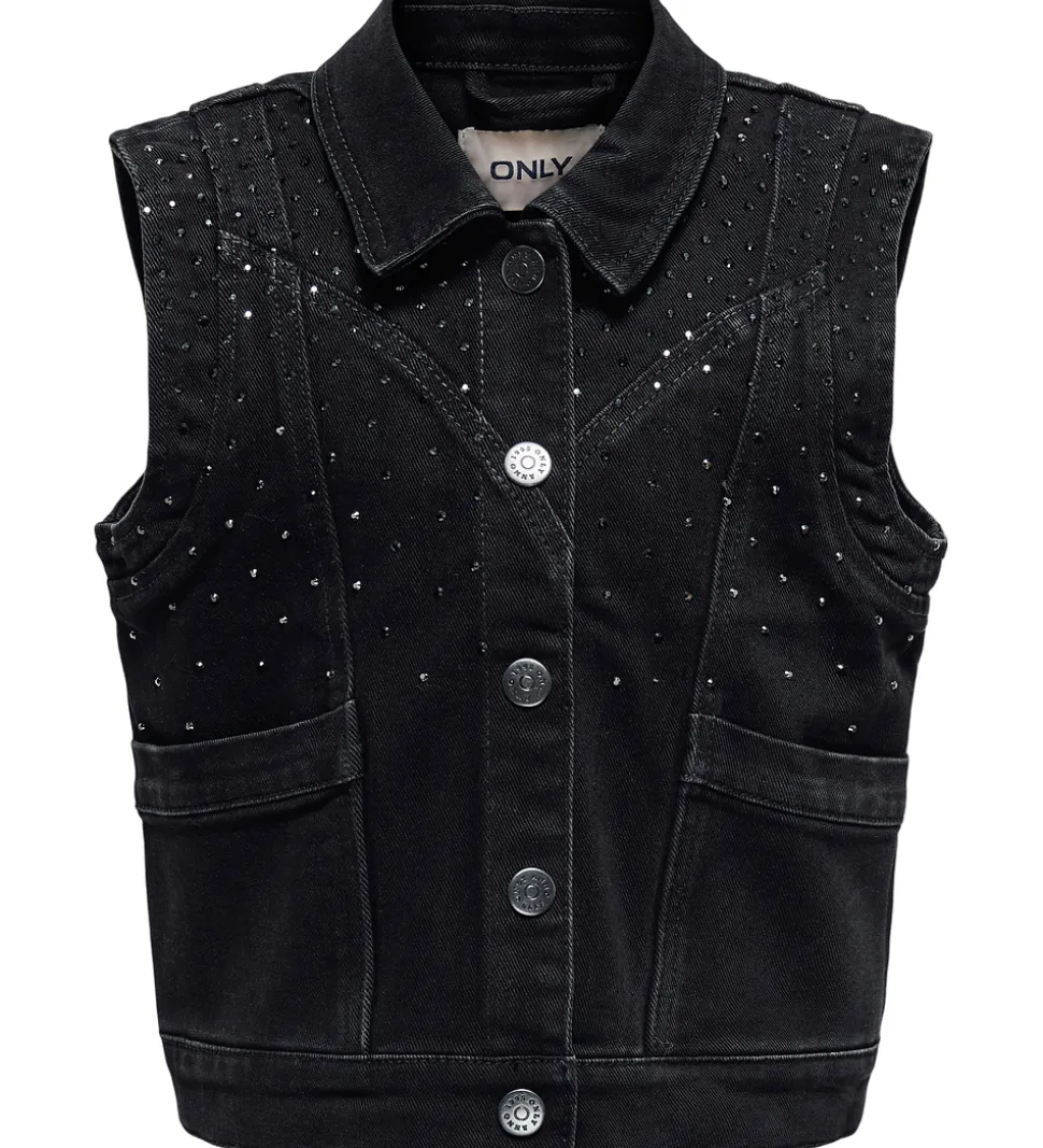 Stilfuld Kids Only denimvest i sort med små, sorte similisten og flotte syninger. Denimvesten er uden ærmer og har en fin krave. Den lukkes fortil med gennemgående trykknapper. Fortil er der en lomme i hver side.