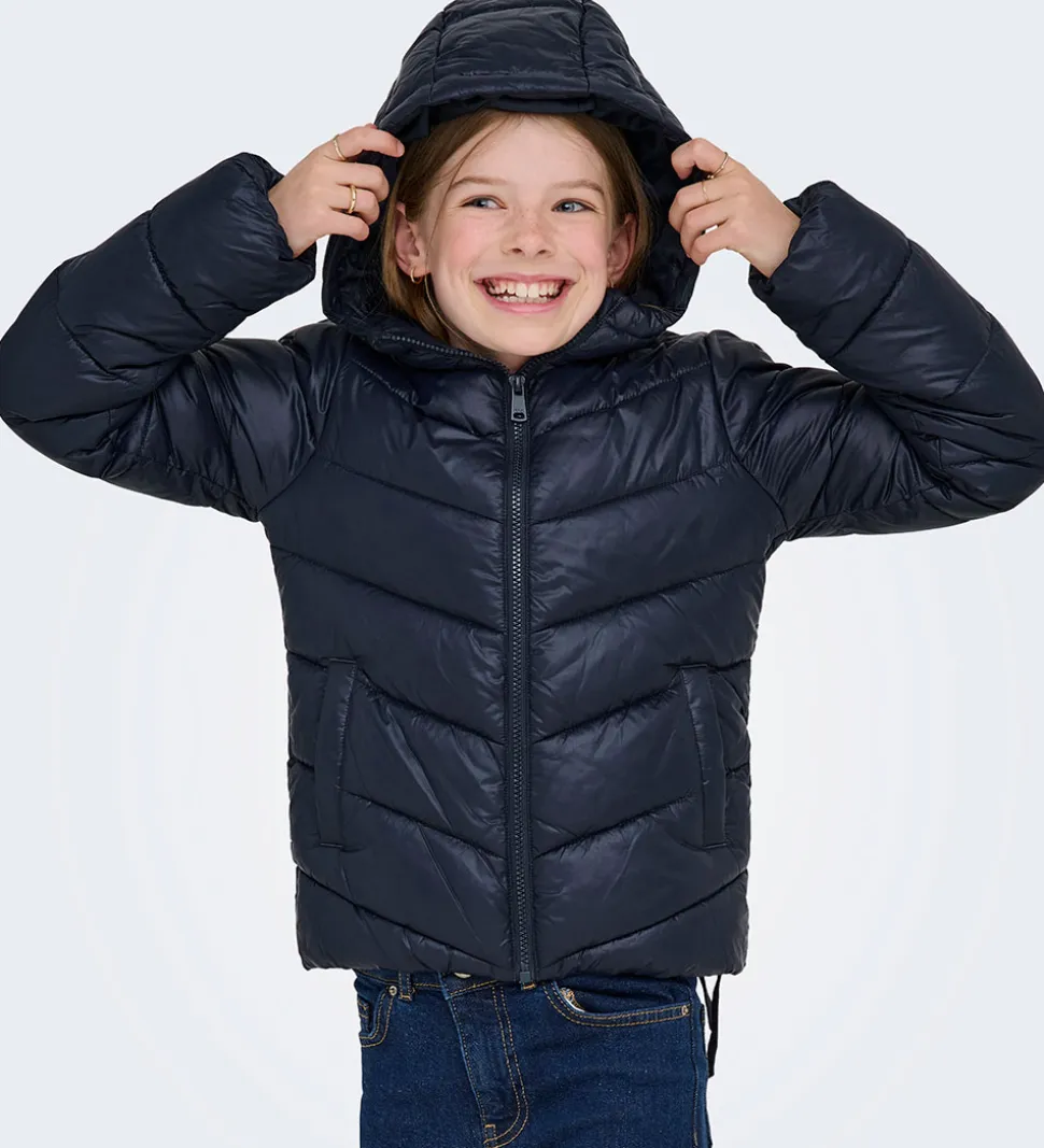 Dejlig Kids Only dynejakke i navyblå med en smule skinnende overflade. Dynejakken er i en glatvævet kvalitet og med skrå syninger.