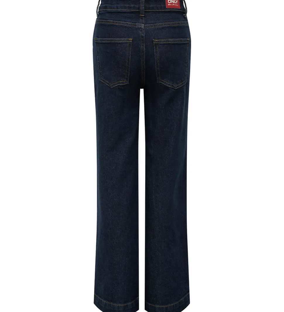 Stilfulde Kids Only jeans i mørkeblå denim med dekorative syninger. Kids Only jeansene har elastik indvendigt, som kan justeres med knapper. De lukkes foran med en hægte og lynlås. De har praktiske bæltestropper, og lommer på for- og bagside. Jeansene har en løs pasform med moderne snit.