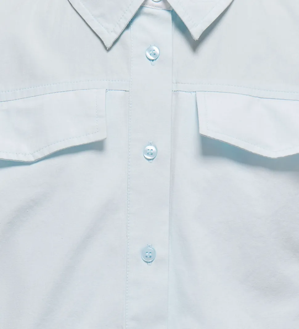 Smagfuld Kids Only skjorte i lyseblå. Skjorten har lange ærmer og to brystlommer, som tilføjer et klassisk udtryk. Kids Only skjorten er en kort model og har en traditionel krave, der fuldender designet.