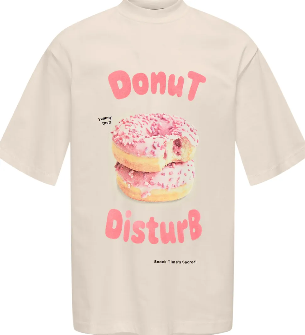 Charmerende Kids Only t-shirt i beige med et sjovt print på forsiden af lyserøde donuts og teksten ‘Donut Disturb’. Kids Only t-shirten har en rund halsudskæring med en smal ribkant og korte ærmer.