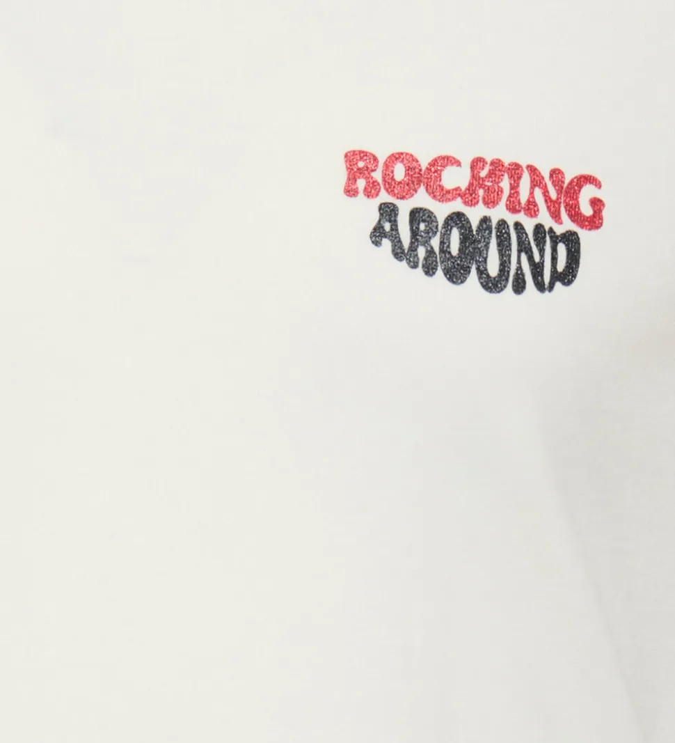 Elegant Kids Only t-shirt i hvid, med et stort juleprint på ryggen med glimmerdetaljer. T-shirten har et iøjnefaldende print på brystet med teksten “Rocking Around” i rød og sort, der giver et cool og moderne udtryk. Kids Only t-shirten har en rund halsudskæring med en smal ribkant og korte ærmer, som fuldender det stilrene look.