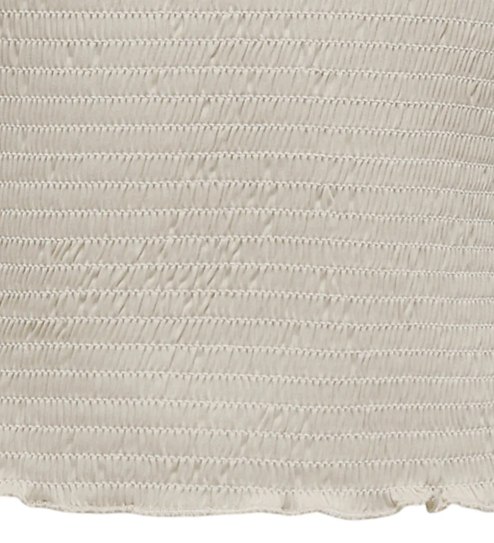Elegant Kids Only t-shirt i sandfarvet med smock-struktur. T-shirten har et off-shoulder design med korte ærmer. Den er lavet i en meget elastisk kvalitet med en tætsiddende pasform.