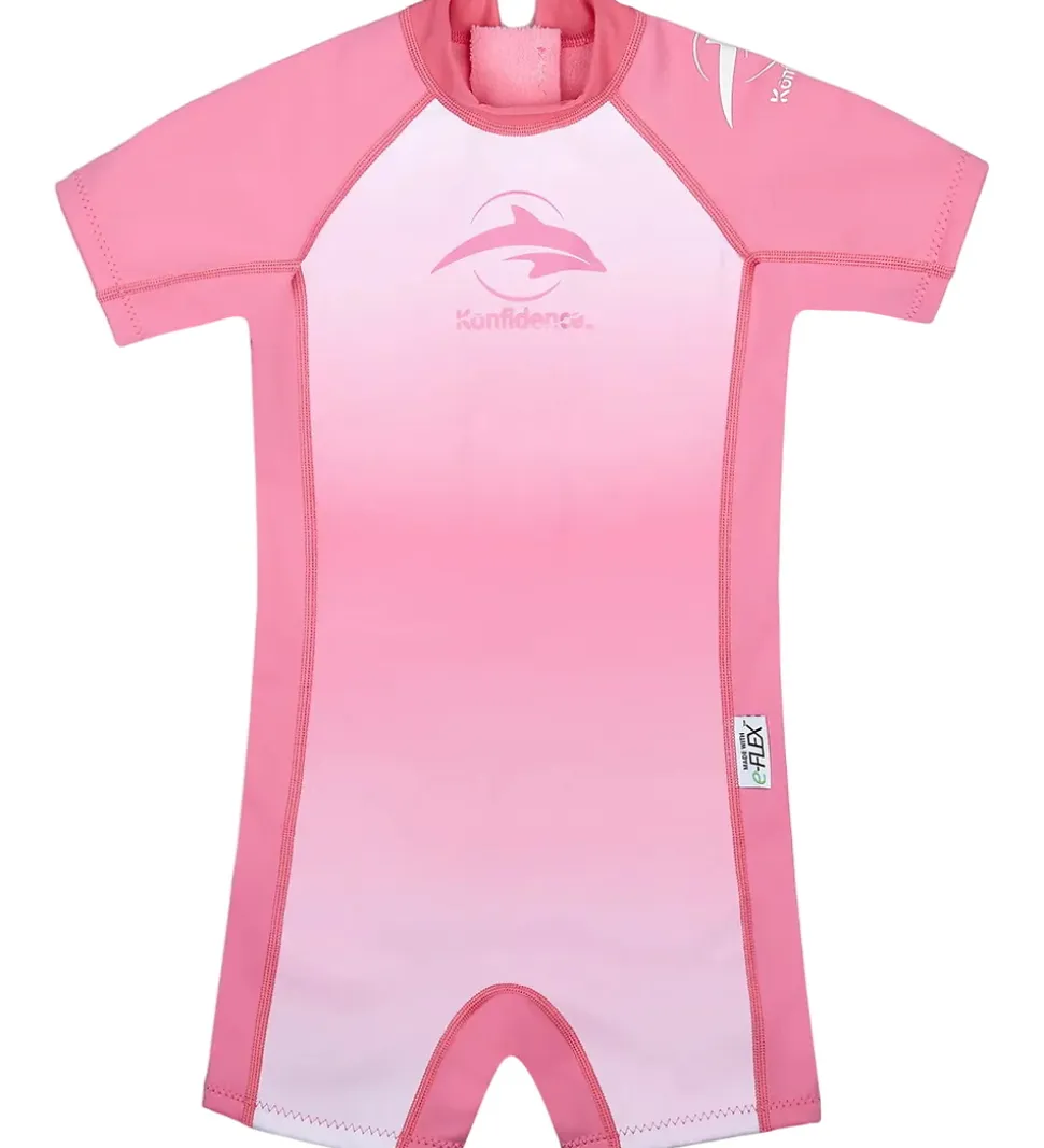 Konfidence badeheldragten har korte ærmer og ben, og den åbnes bagpå med en lynlås. I halsåbningen er der en bred kant, og badeheldragten er lavet i en god, kraftig kvalitet så barnet ikke får det koldt. Indvendigt er der blødt plysforing, for ekstra komfort.