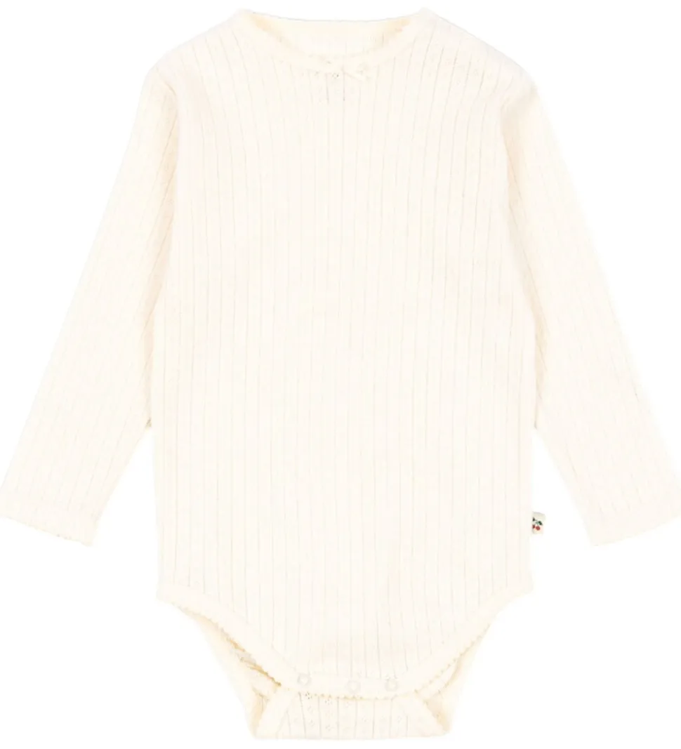 Elegant Konges Sløjd body i ensfarvet hvid med et flot hulmønster. Den langeærmede model har en rund halsudskæring dekoreret med en lille sløjfedetalje. Konges Sløjd sørger for en praktisk lukning med trykknapper ved venstre skulder og i bunden, som gør det nemt at klæde barnet på.