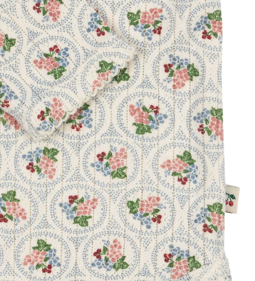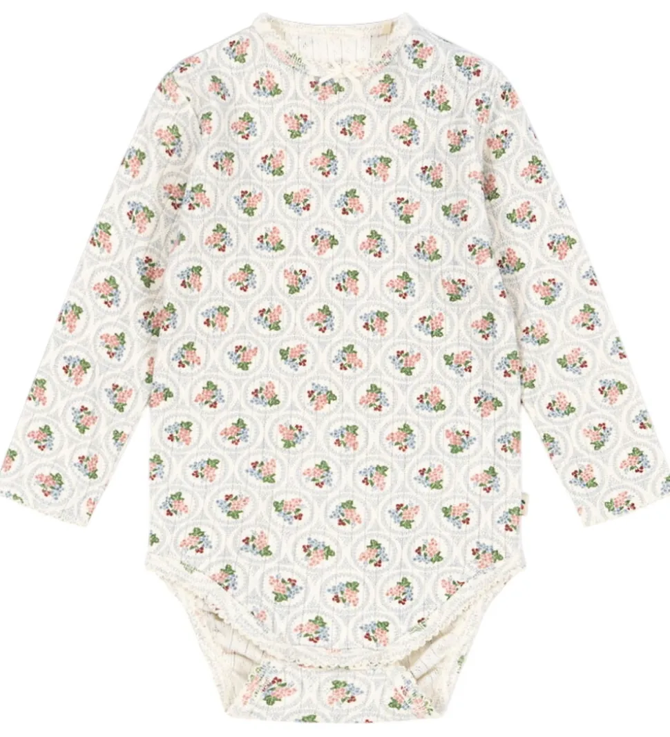 Elegant Konges Sløjd body i hvid med et delikat blomstermønster i blå og rosa nuancer. Bodyen har lange ærmer og en rund halsudskæring.