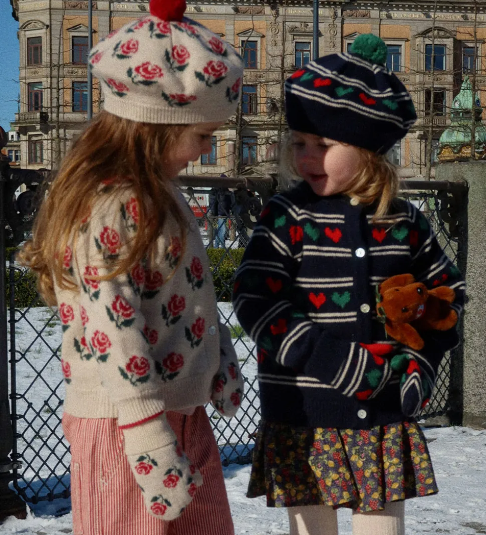 Charmerende Konges Sløjd cardigan med et smukt rosenmotiv i røde og grønne farver på en lys beige baggrund. Denne Konges Sløjd cardigan har en sød flæse i halsåbinngen, og den lukkes med fine knapper langs fronten. Ribstrikdetaljerne ved hals, ærmer og talje giver en klassisk struktur. Cardiganen er lavet i en strikket kvalitet i en lun uldblanding.