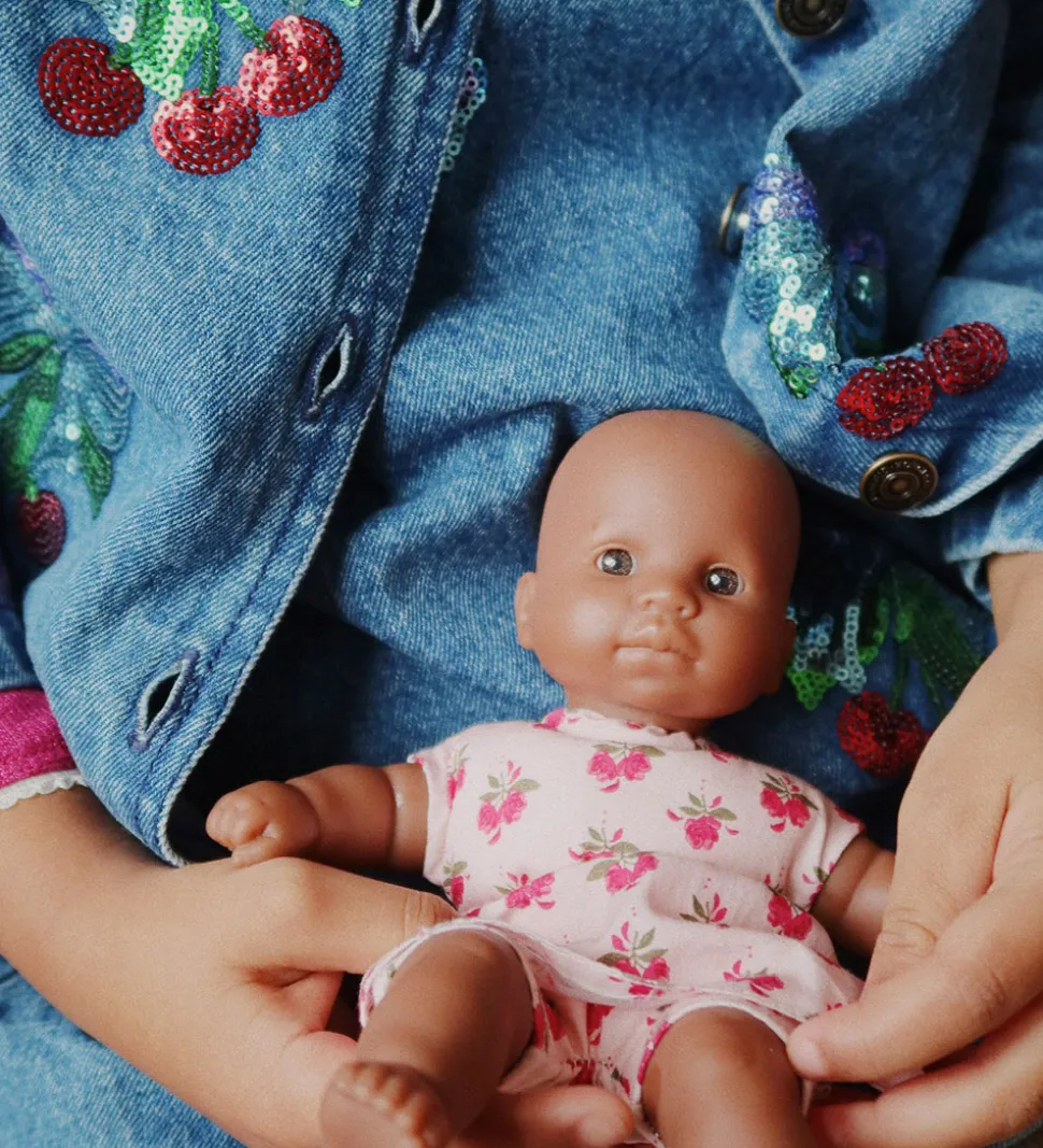 Elegant Konges Sløjd denimjakke i en klassisk, blå denimnuance med smukke pailletbroderinger af sommerfugle og kirsebær i flere farver. Denimjakken er designet med rund halsudskæring og har en række dekorative knapper i midten.