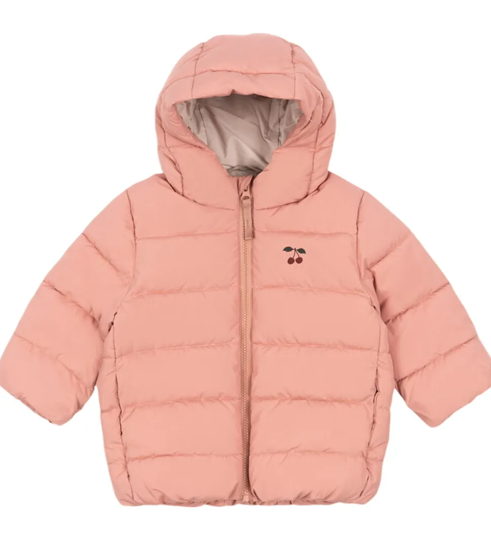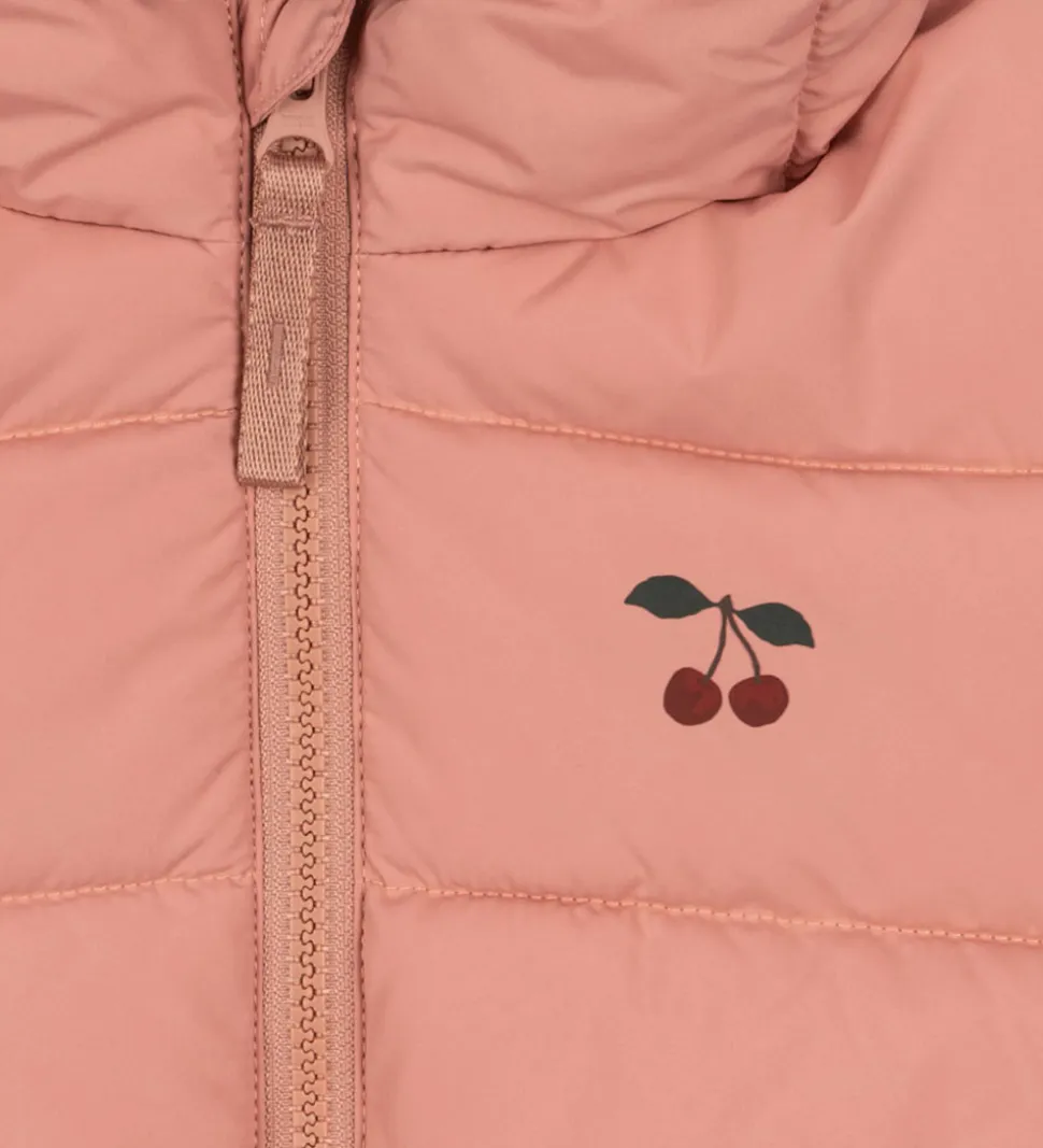 Fin Konges Sløjd dynejakke i ensfarvet rosa med et lille kirsebærprint på brystet.