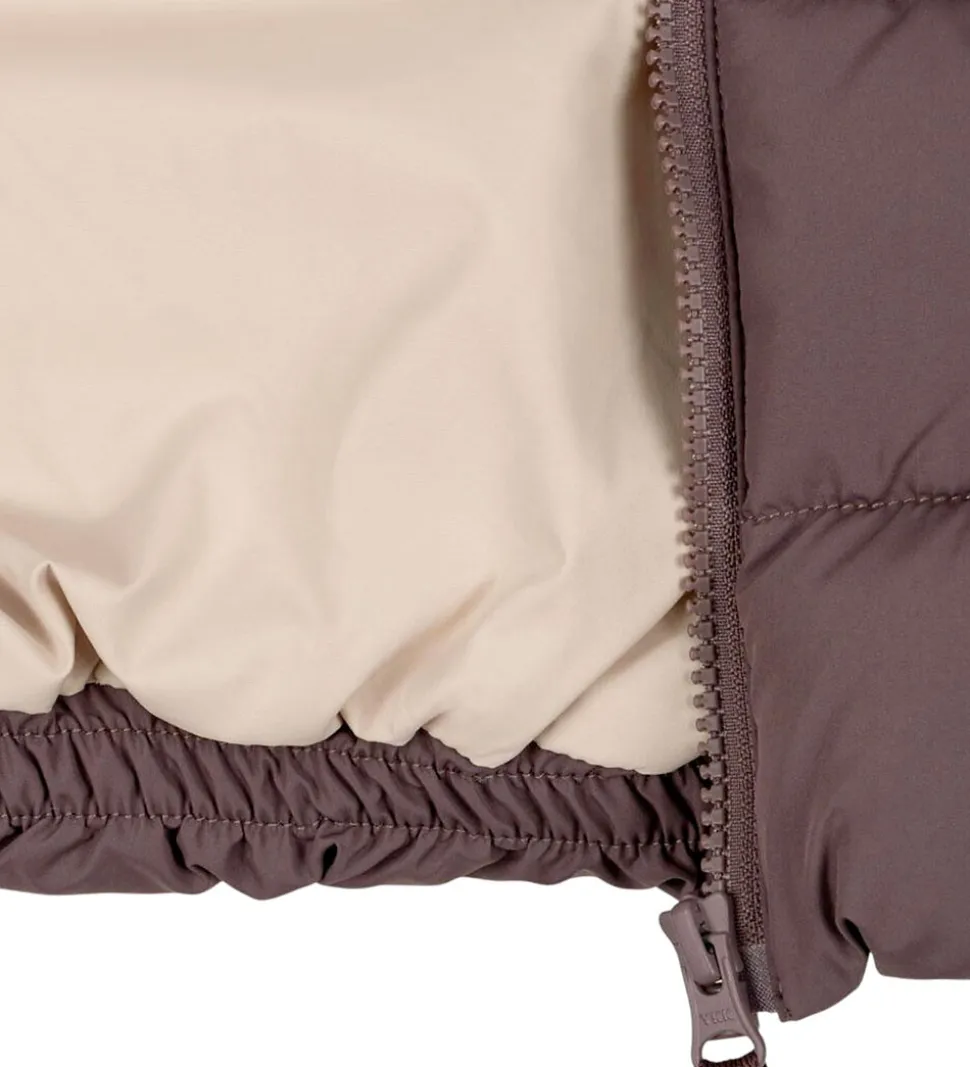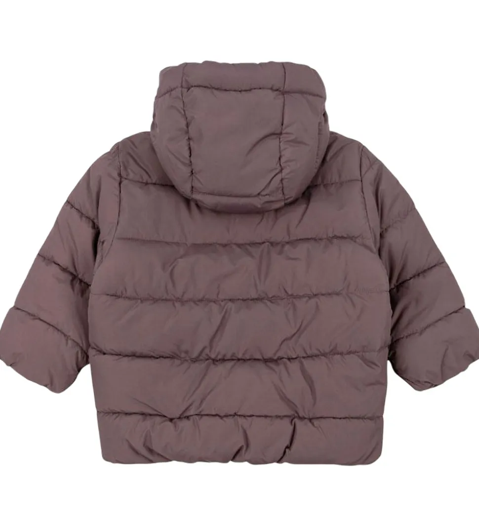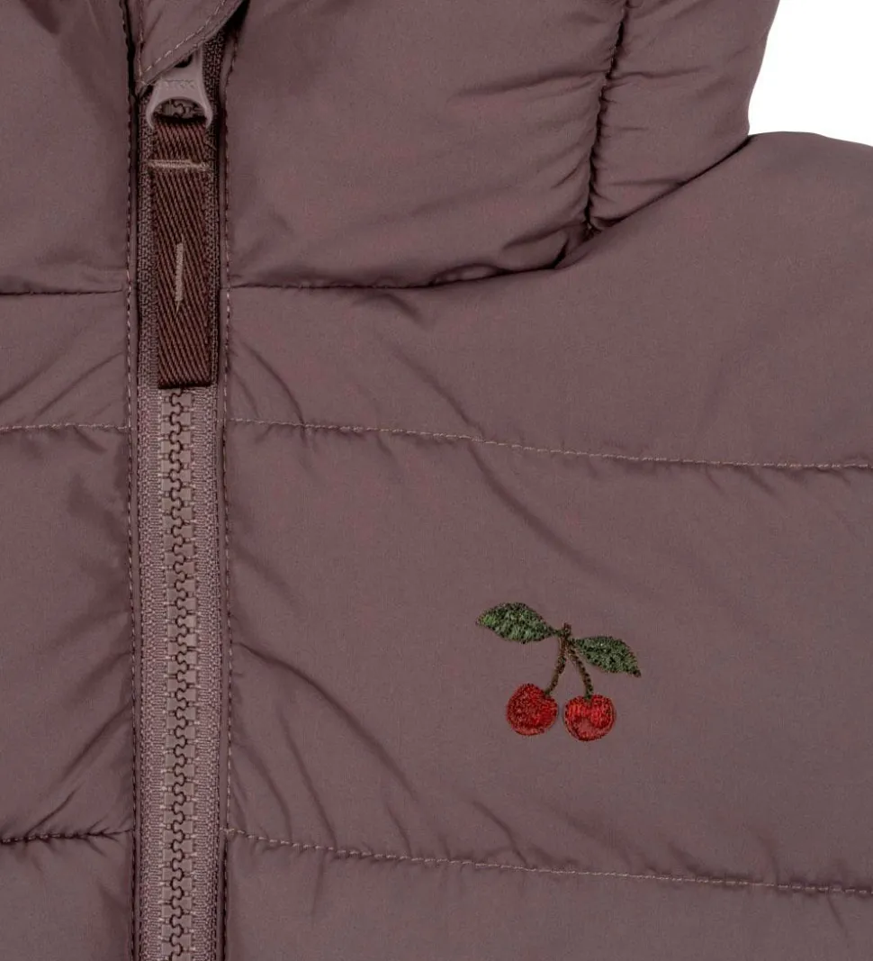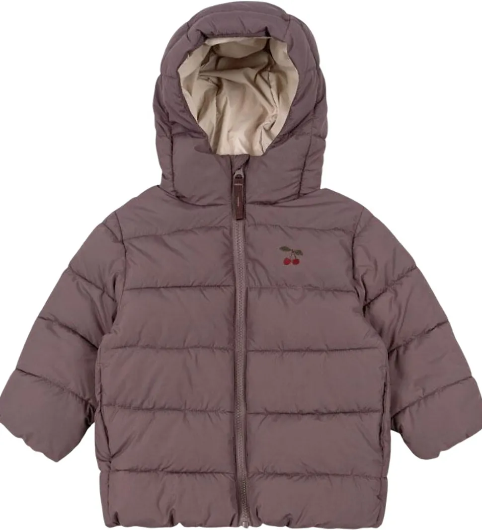 Skøn Konges Sløjd dynejakke i en støvet, lilla nuance og med et lille kirsebærprint på brystet.