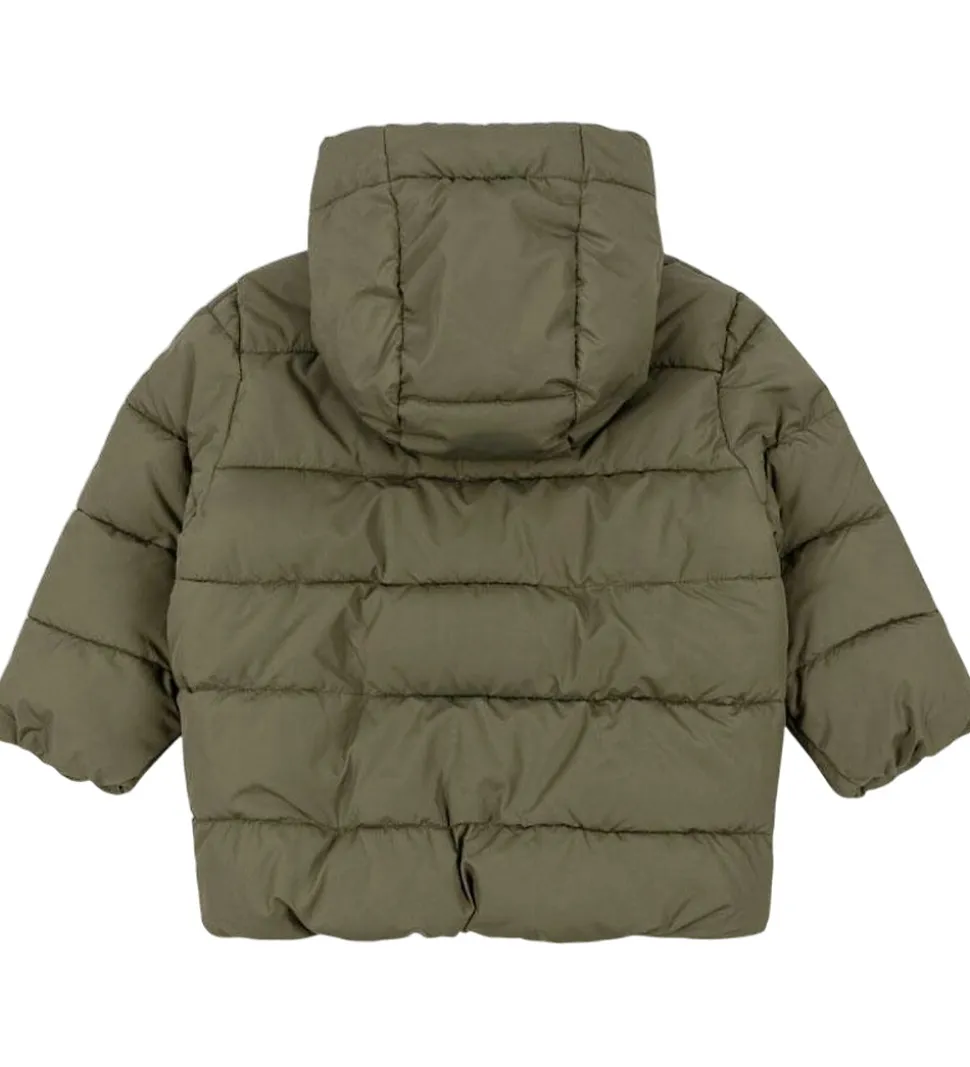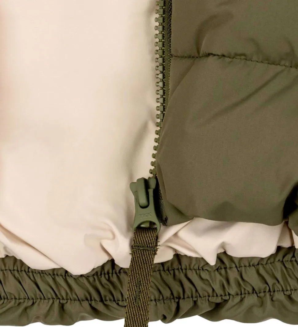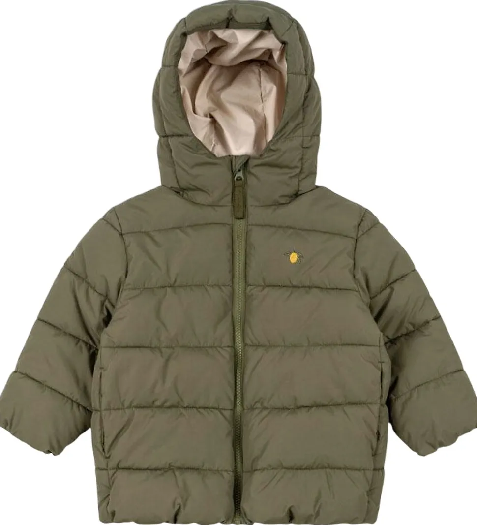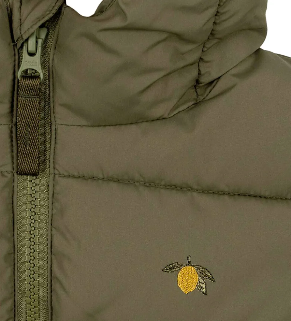 Lækker Konges Sløjd dynejakke i ensfarvet grøn med et lille citronprint på brystet.