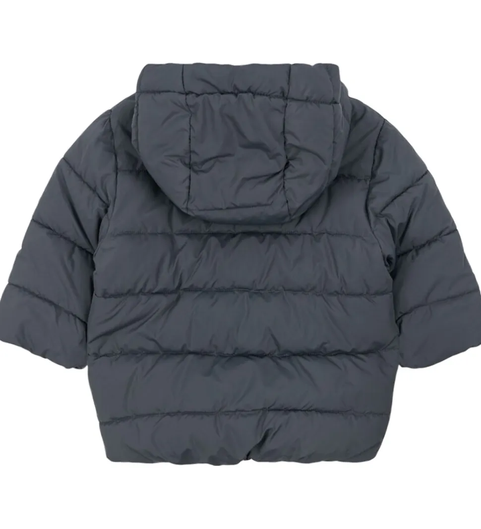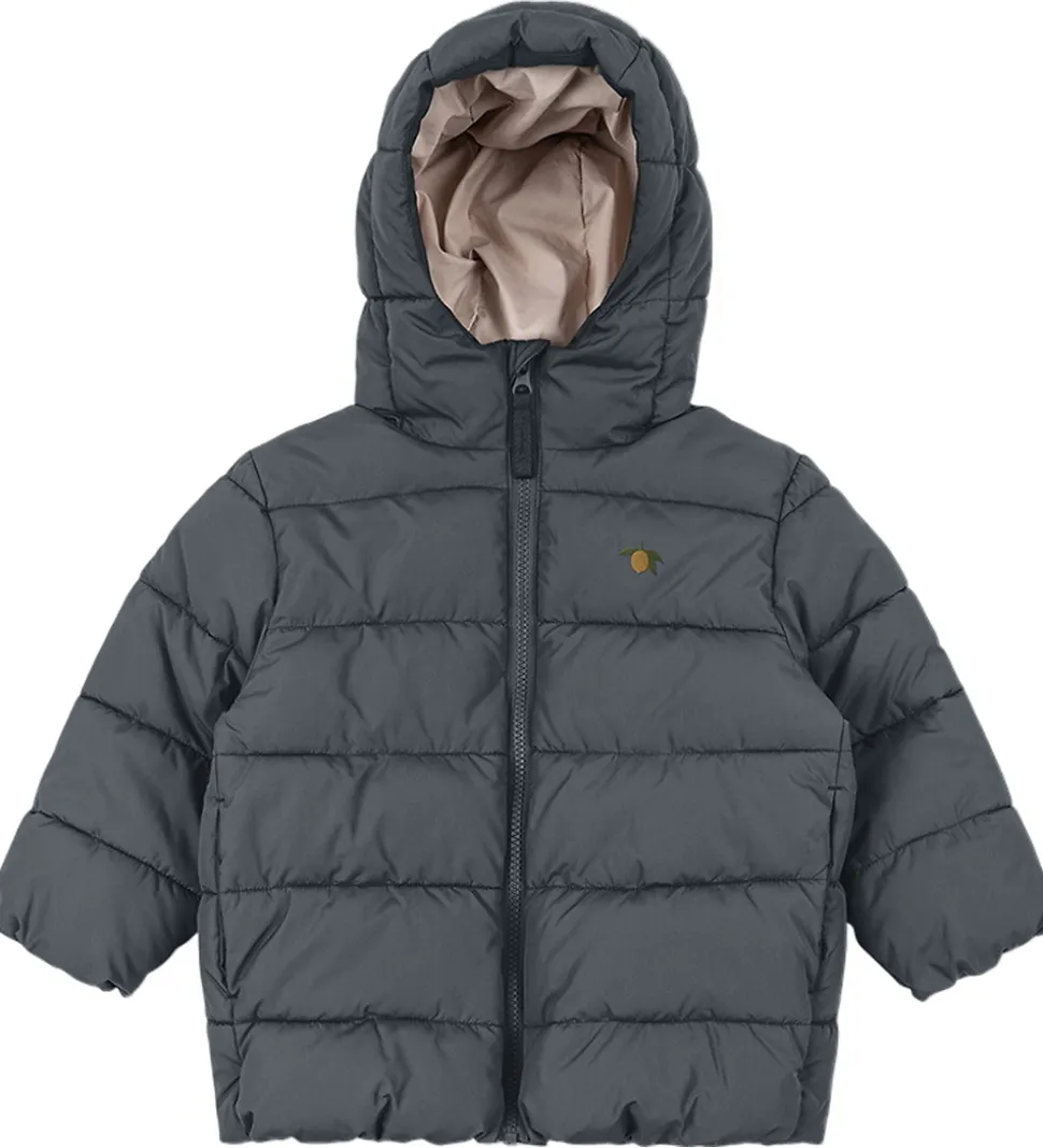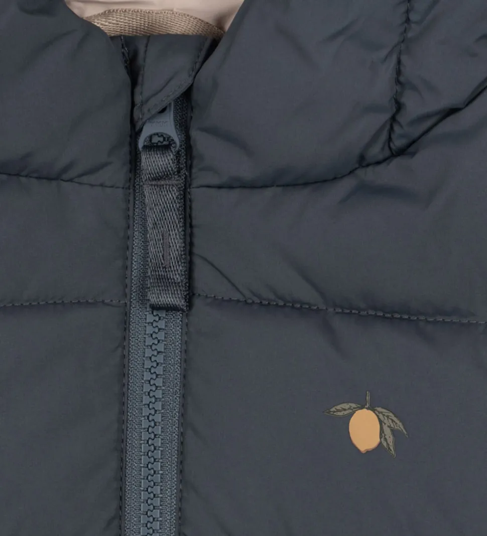 Skøn Konges Sløjd dynejakke i ensfarvet mørkegrå med et lille citronprint opå brystet.