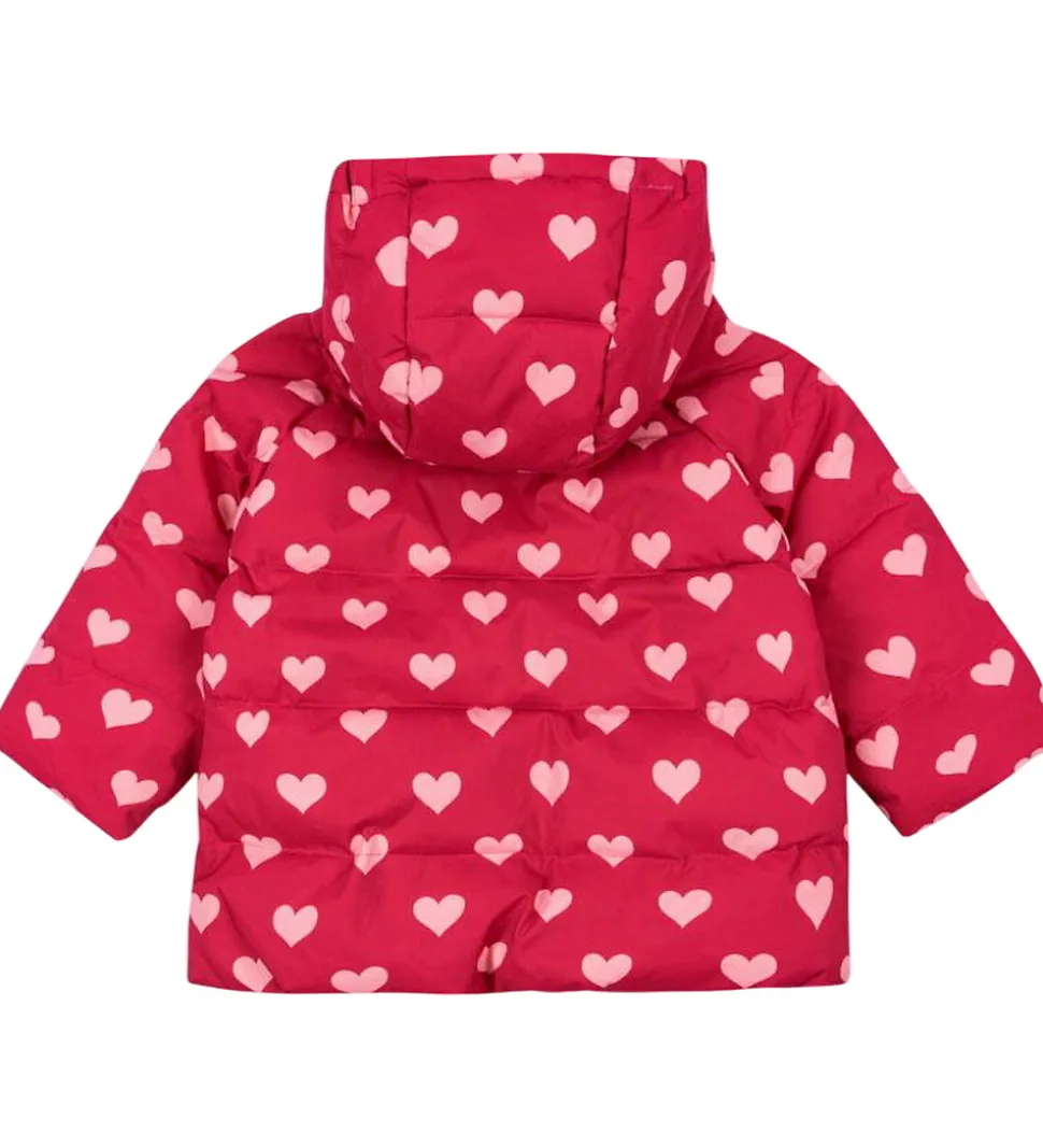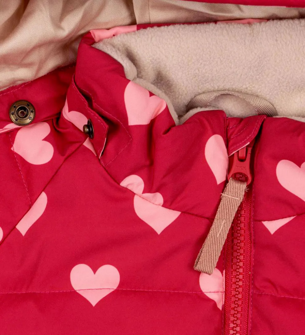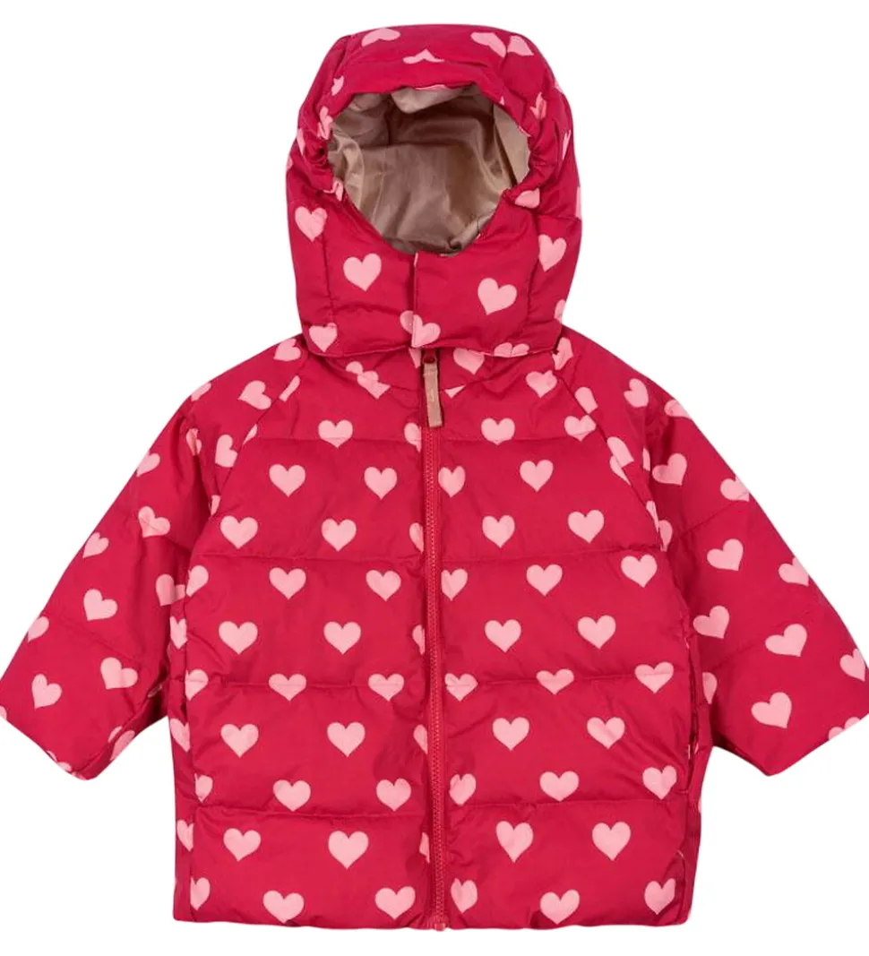 Sød Konges Sløjd dynejakke i en frisk rosa med et alloverprint af lyserøde hjerter. Dynejakken er med vandrette syninger.