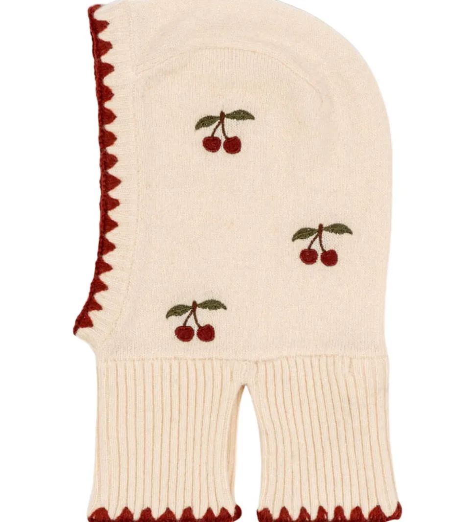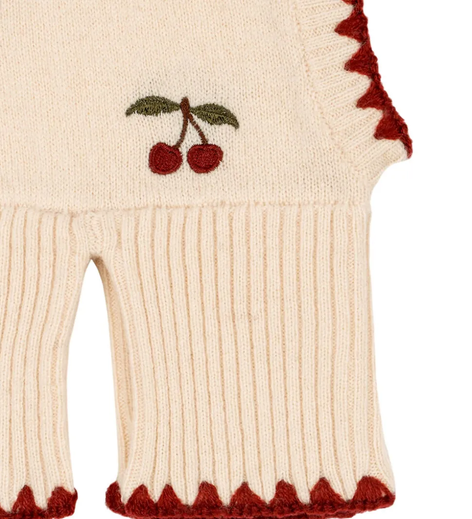 Skøn Konges Sløjd luffer i creme med et pudderrosa skær og med røde, broderede kirsebær. Langs kanterne er der et rødt, broderet mønster. Elefanthuen har en rund hovedform, og den har et praktisk spildesign i bunden. Elefanthuen består af et enkelt lag i en blød, strikket uldkvalitet.