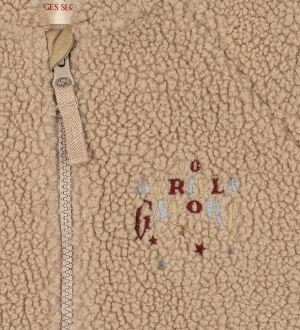 Konges Sløjd fleecejakken er designet med en mellemhøj hals og lange ærmer. Fleecejakken har en lynlås foran, som er udstyret med en praktisk hagebeskytter og indvendig vindstolpe. På brystet er en broderet tekst og på ryggen er en broderet gorilla.
