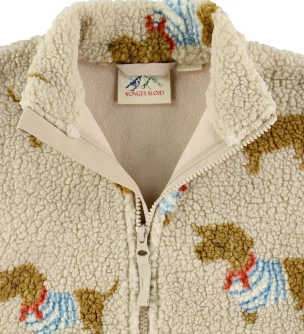Charmerende Konges Sløjd fleecejakke i beige teddyfleece dekoreret med et mønster af brune hunde iklædt farverige trøjer. Fleecejakken har en dejlig melemhøj hals og lange ærmer, som giver et klassisk look.