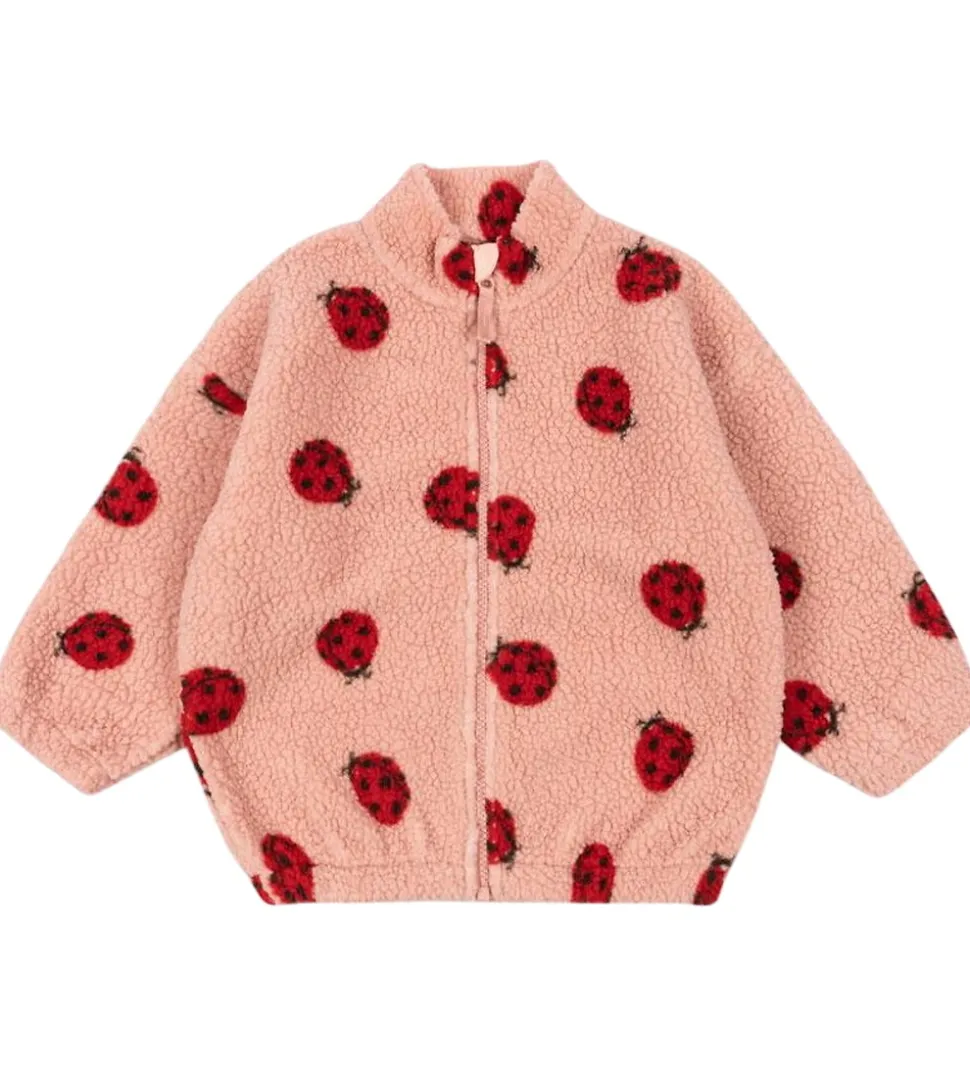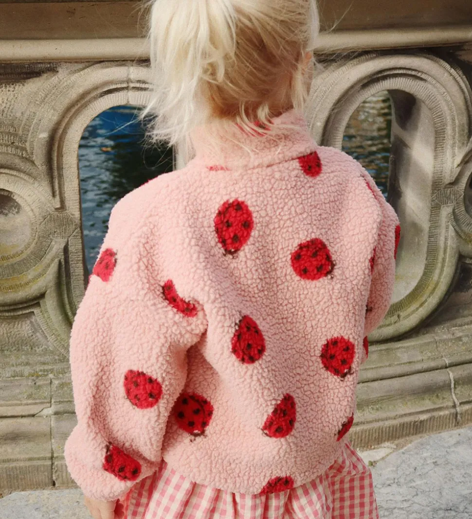 Lækker Konges Sløjd fleecejakke i lyserosa teddyfleece og med et alloverprint af mariehøns i rød og sort.