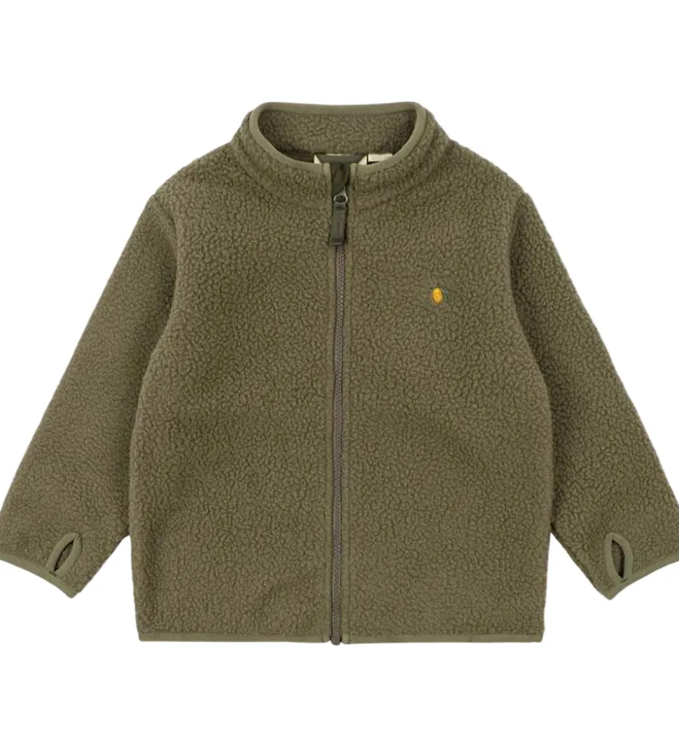 Behagelig Konges Sløjd fleecejakke i en varm, olivengrøn farve. Fleecejakken er lavet af blødt teddyfleece, der giver et enkelt og stilfuldt udtryk. Den lille, broderet citron i gul tilføjer en diskret detalje.