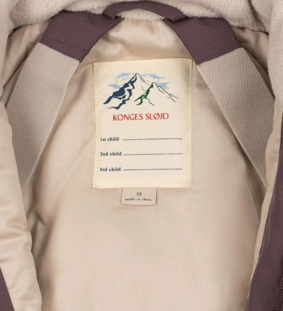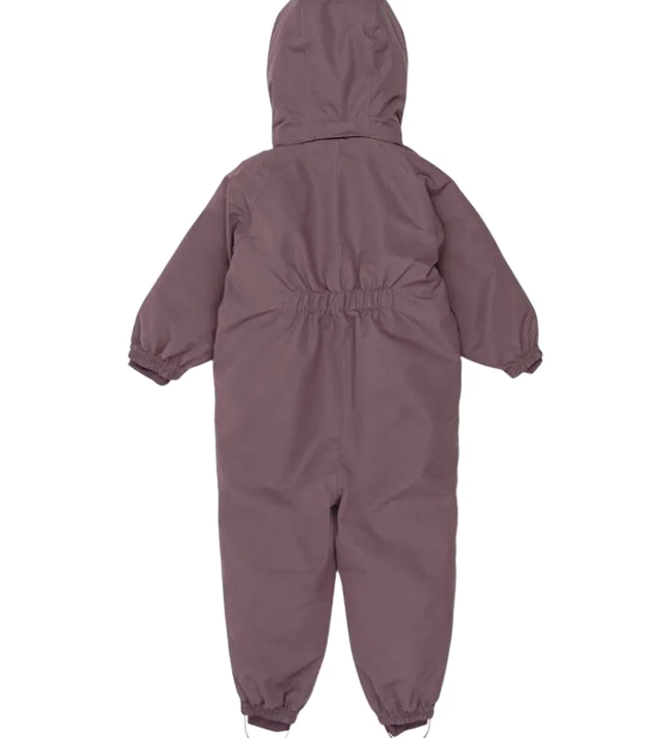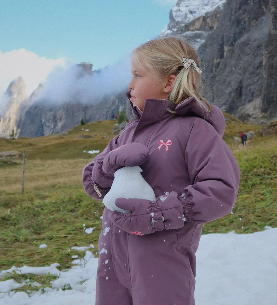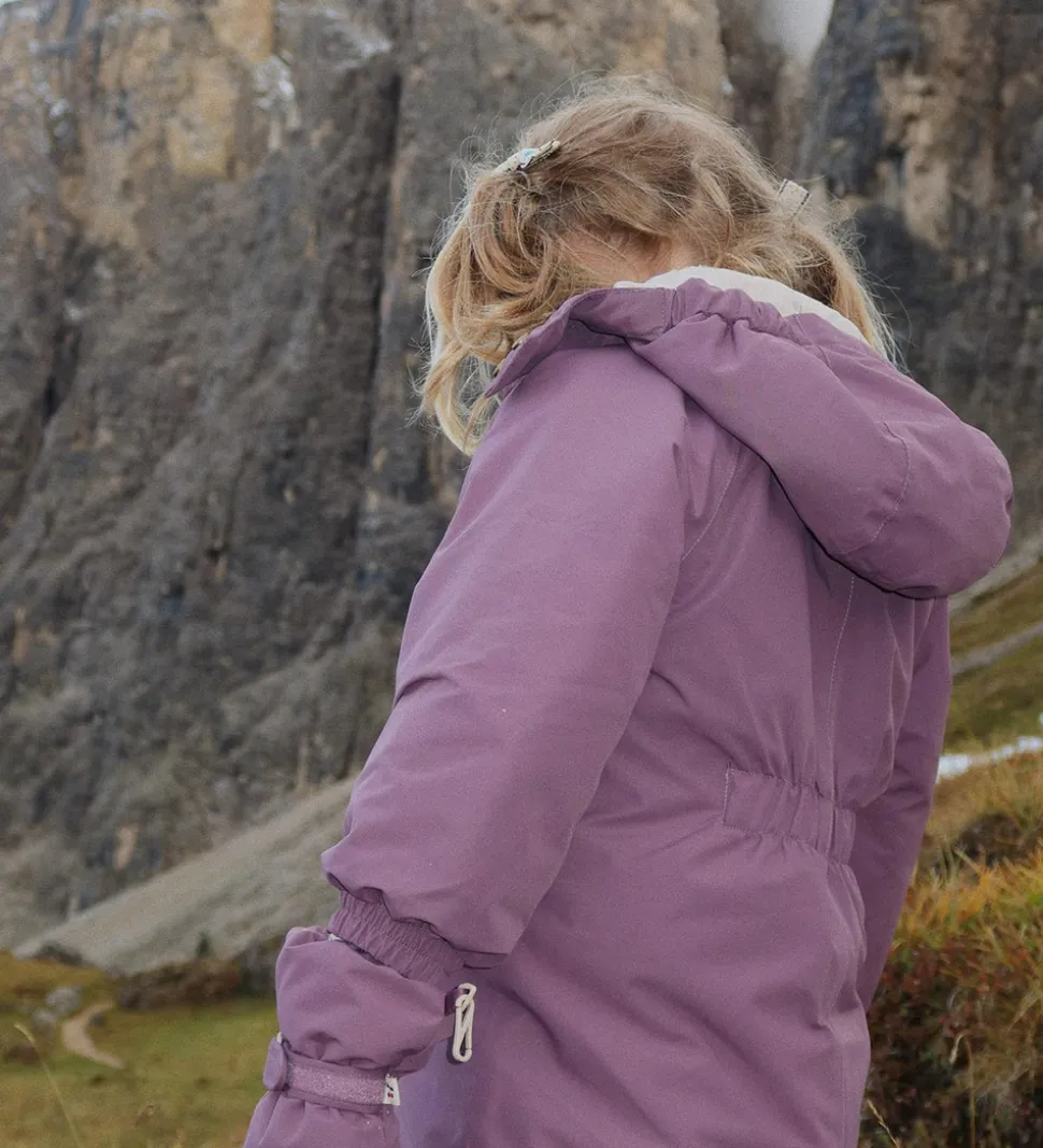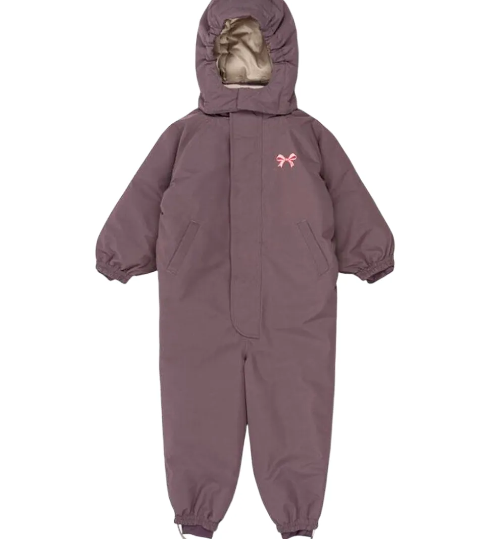 Fin Konges Sløjd flyverdragt i en støvet lilla og med en lille sløjfe broderet øverst i venstre side.