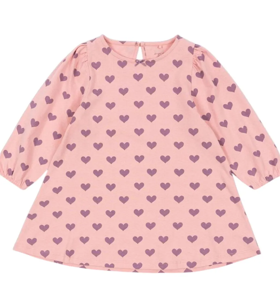 Indbydende Konges Sløjd kjole i en sart, rosa nuance dekoreret med små, lilla hjerter. Kjolen har lange ærmer med let puf og rund halsudskæring. Konges Sløjd kjolen er lavet med en blød struktur, der skaber et behageligt udtryk.