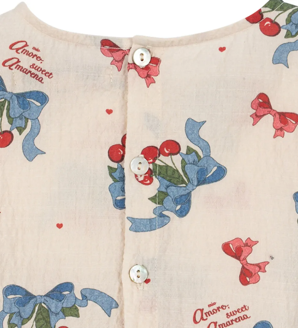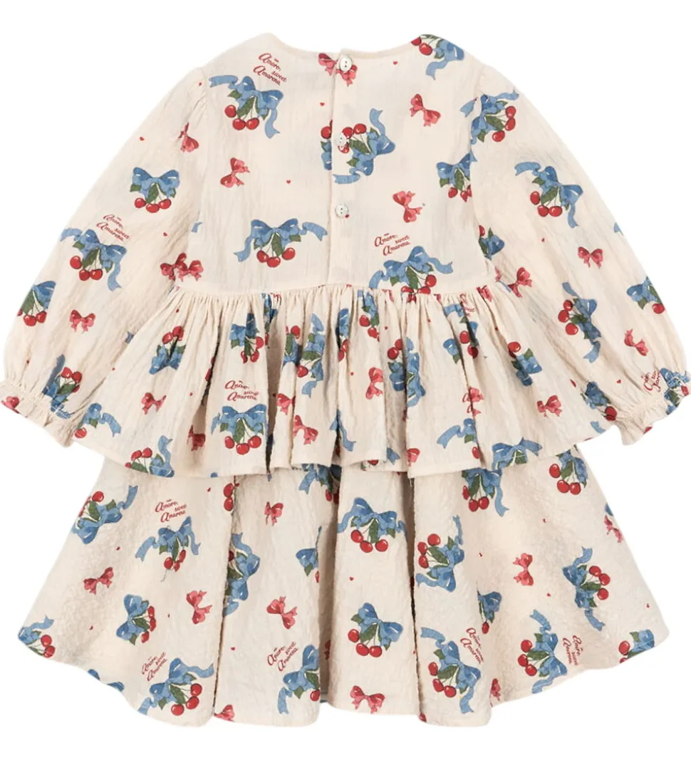 Kjolen er dekoreret med et mønster af kirsebær, blå sløjfer og små, røde hjerter. Foroven har kjolen et raffineret skørt, der skaber en fin lag-på-lag effekt. Konges Sløjd kjolen har en rund halsudskæring og lukker med knapper i nakken.